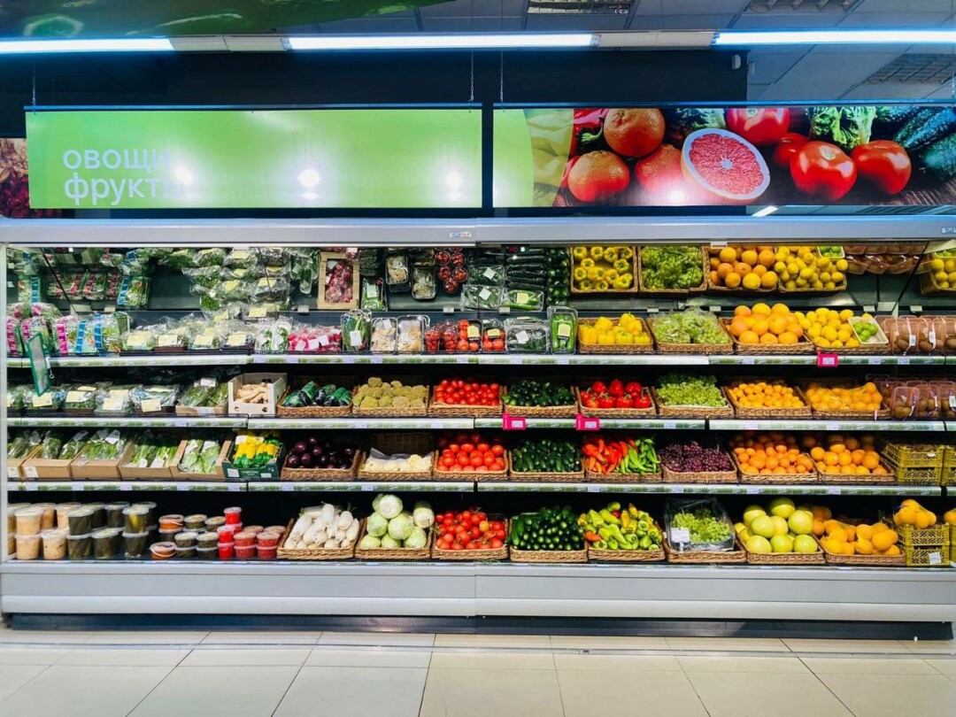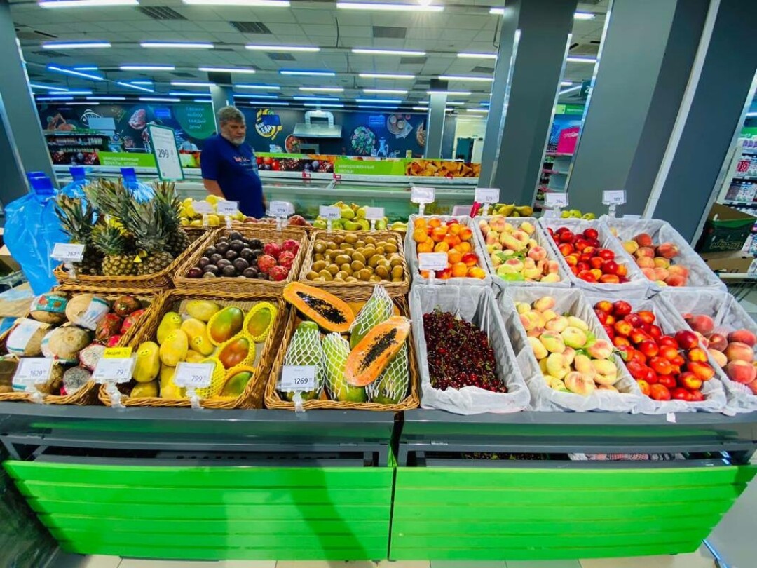 При входе покупателей встречает ароматная и сочная зона фруктов и овощей, в которой будут представлены и экзотические фрукты: тамаринд, гуава, питахайа, кокос, кумкват, физалис, артишок, фейхоа, а также голубика, ежевика, клубника.