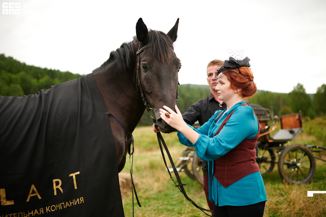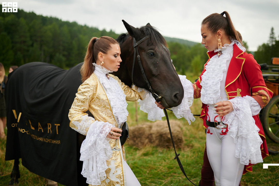 Перед нами самый расцвет парфорсной охоты – Франция во времена Людовика 14, когда на охоту надевались красные фраки, лосины и ботфорты со шпорами. Здесь скорее речь не о стилизации, а именно о костюме, но подготовка и проработка образа заслуживают похвалы.