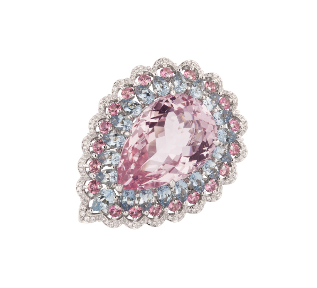 Кружевное кольцо из белого золота с аквамаринами-«маркиз», розовыми сапфирами, бриллиантами и почти двадцатикаратным морганитом — одно на весь свет.