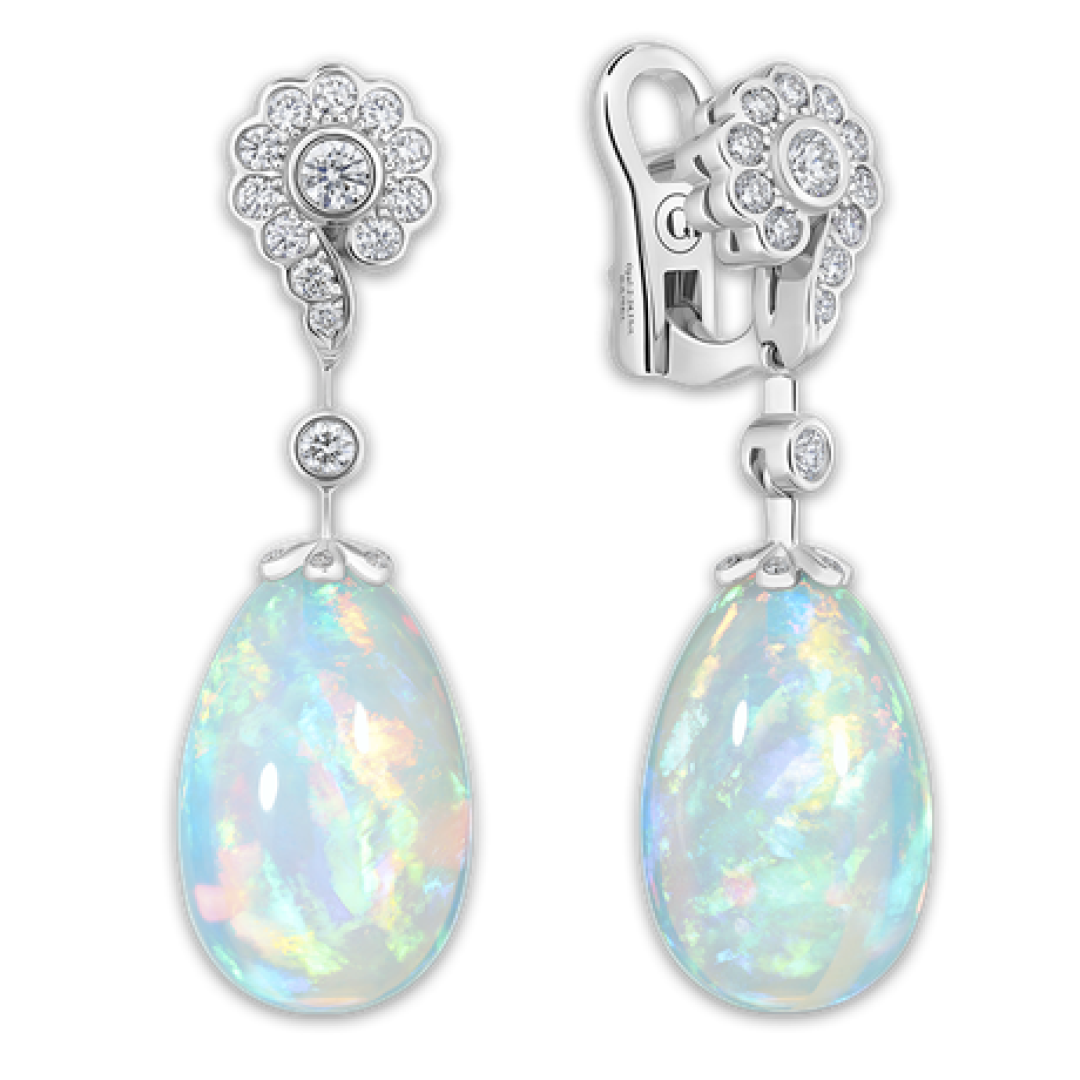 Канонические зимние серьги составлены из двух четырнадцатикаратных опалов и 38 бриллиантов.
