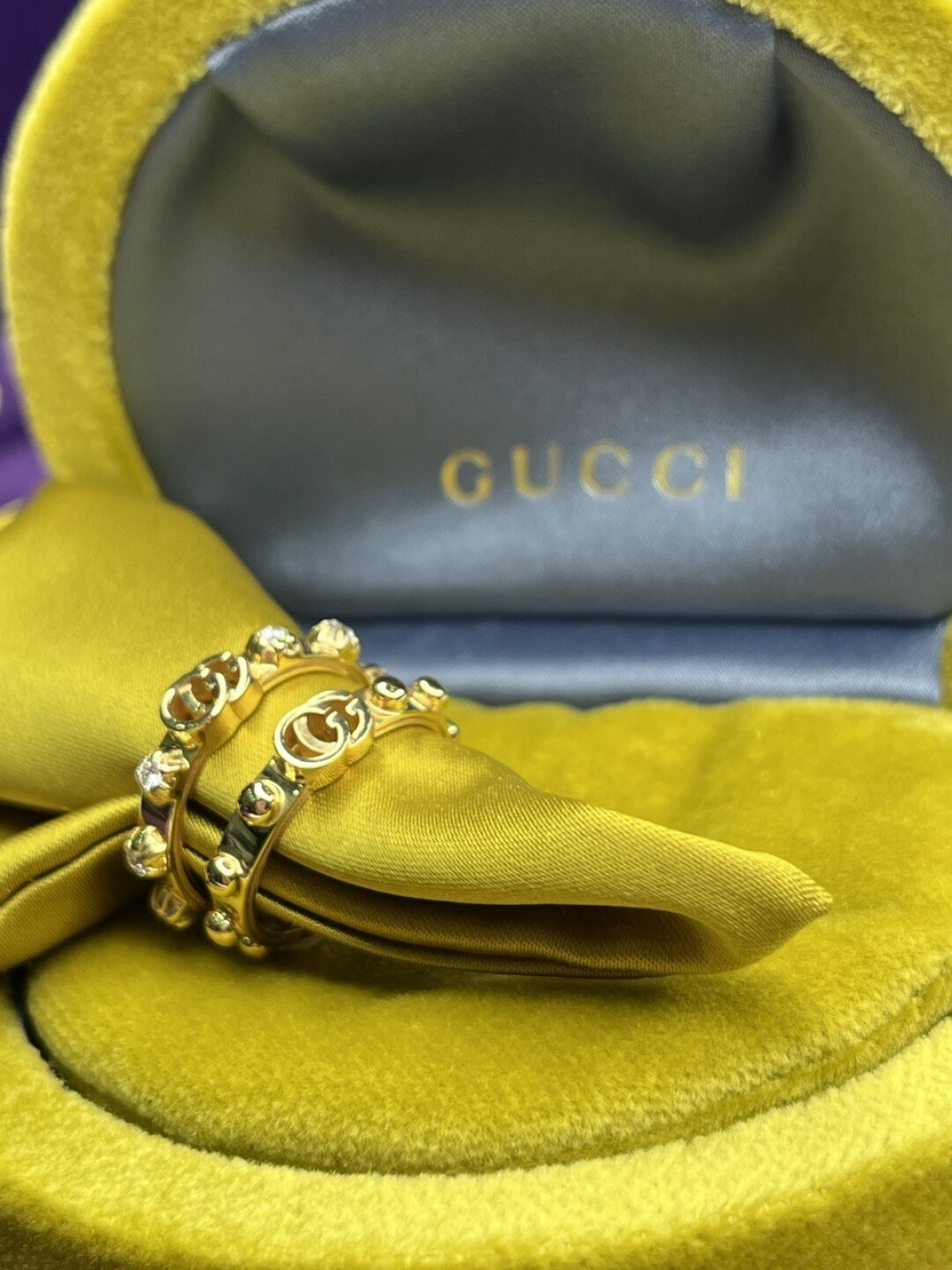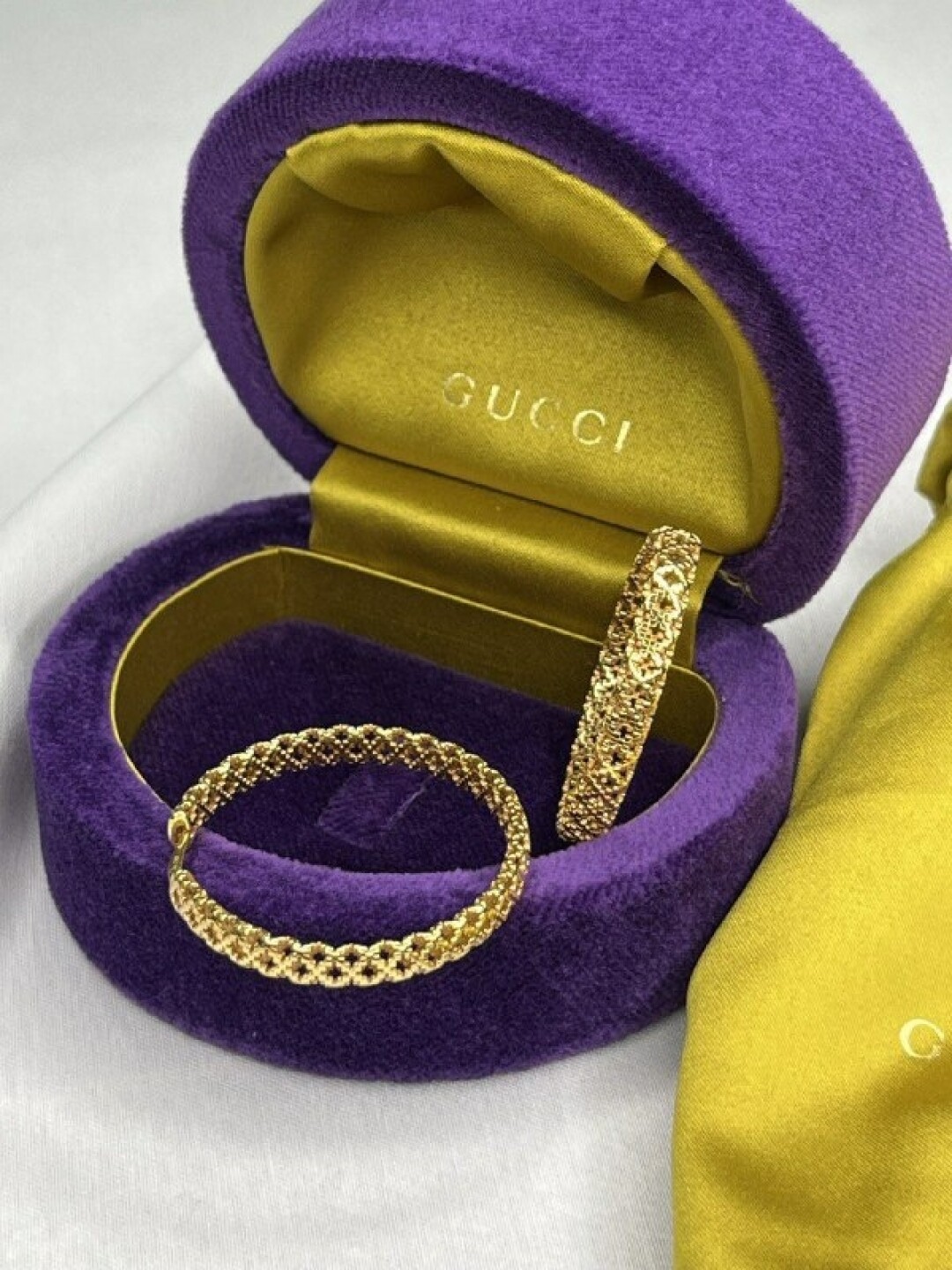 Элегантная утонченная модель из желтого золота и монограммы бренда из двух переплетенных букв G. Гравировка, замысловатые детали и миниатюрный размер добавляют изысканности.