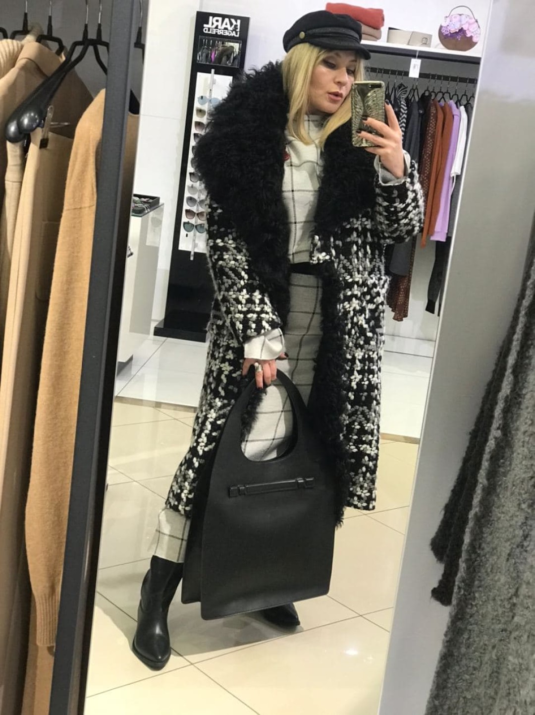 Второй точкой выбора моей обзорной поездки стал магазин «Керимофф». В нем я свой выбор остановила на шляпе «ФедОра» из шерсти, платке с леопардовым принтом и утепленном плаще-двойке со стегаными элементами, что является тоже безусловным трендом этого сезона. Изделие + жилет.