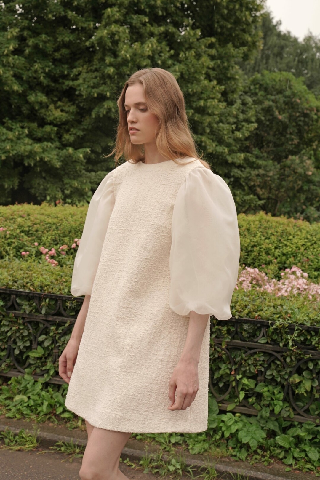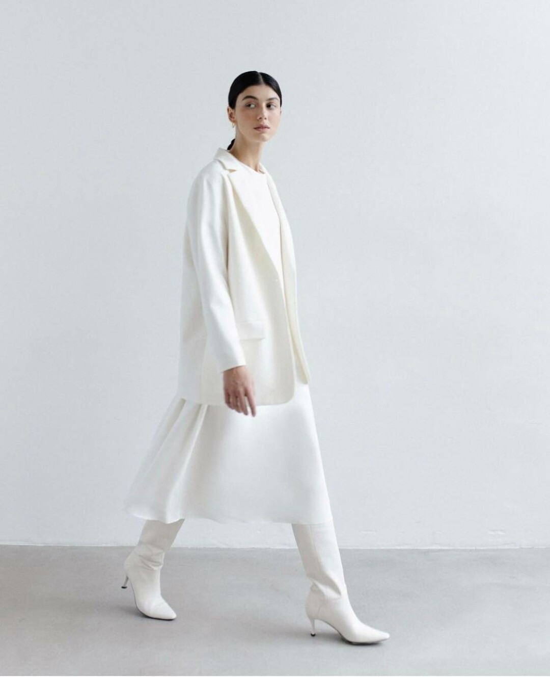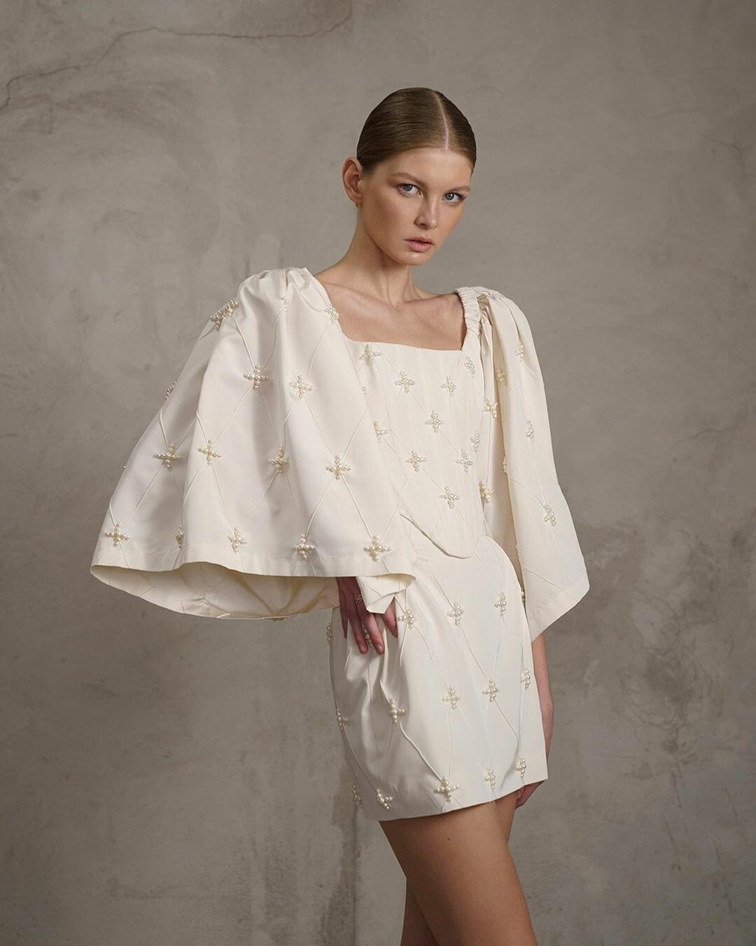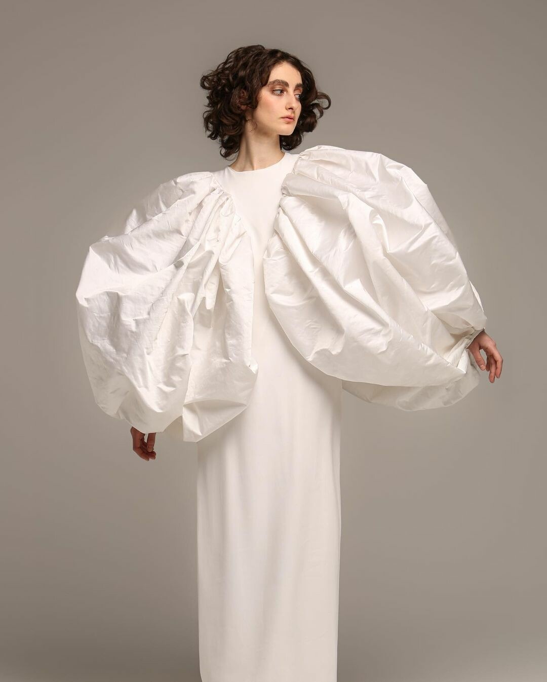 То самое платье можно найти и у тех брендов, которые не позиционируют себя как свадебные. Например, у Et Moi — марки победительницы нашего конкурса «Новые имена в моде» — 2021 Алены Шичкиной. Дизайнер изучает восприятие женщин в контексте истории с отсылками к разным эпохам и традициям и вшивает в феминные платья и блузы национальные культурные коды. В вещах Et Moi есть вполне себе свадебный потенциал. Рекомендуем присмотреться к миди и мини-платьям, плащу и пиджаку со складками на спине, свободным белым брюкам и длинному колье из японского бисера.
