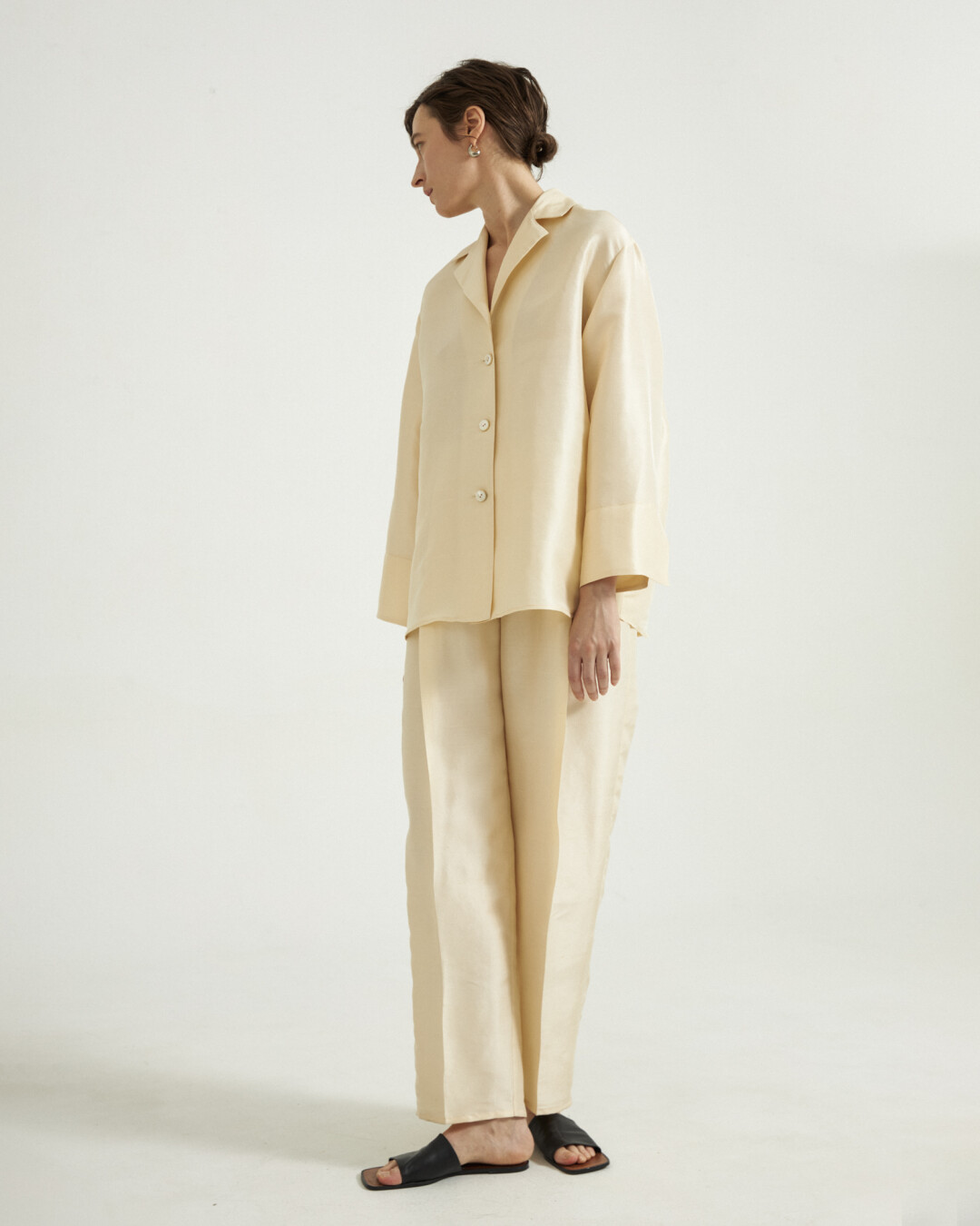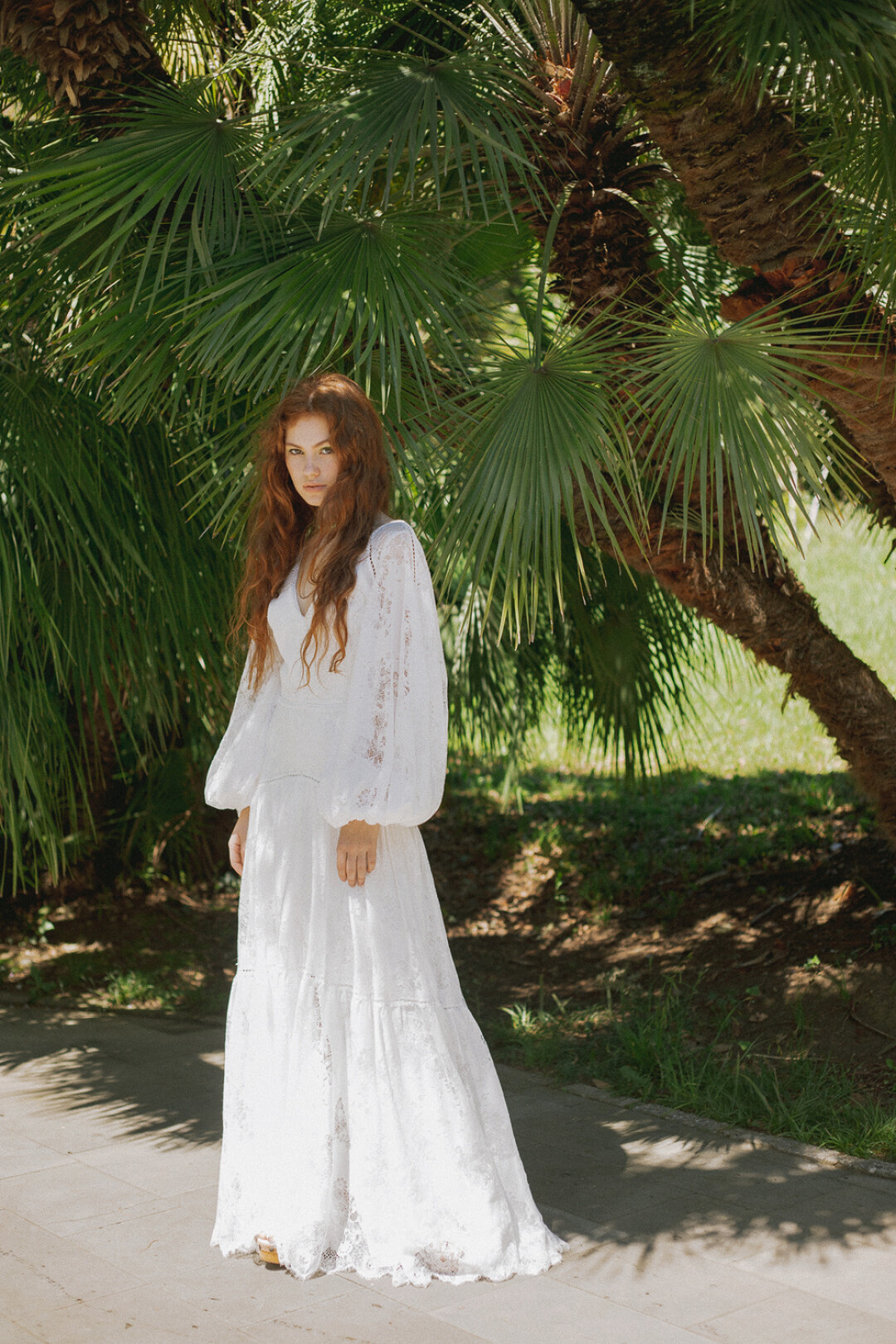 Мини-юбка, платье с рукавами-фонариками, блуза с воротником-стойкой, прозрачное платье-рубашка, брюки палаццо, корсет, классический топ — и все это из воздушного шелка и натурального хлопка. Вещи марки действительно как будто парят, делая невесту невесомой. Можно самой собрать свадебный комплект из отдельных вещей или сделать выбор в пользу традиционной комбинации.