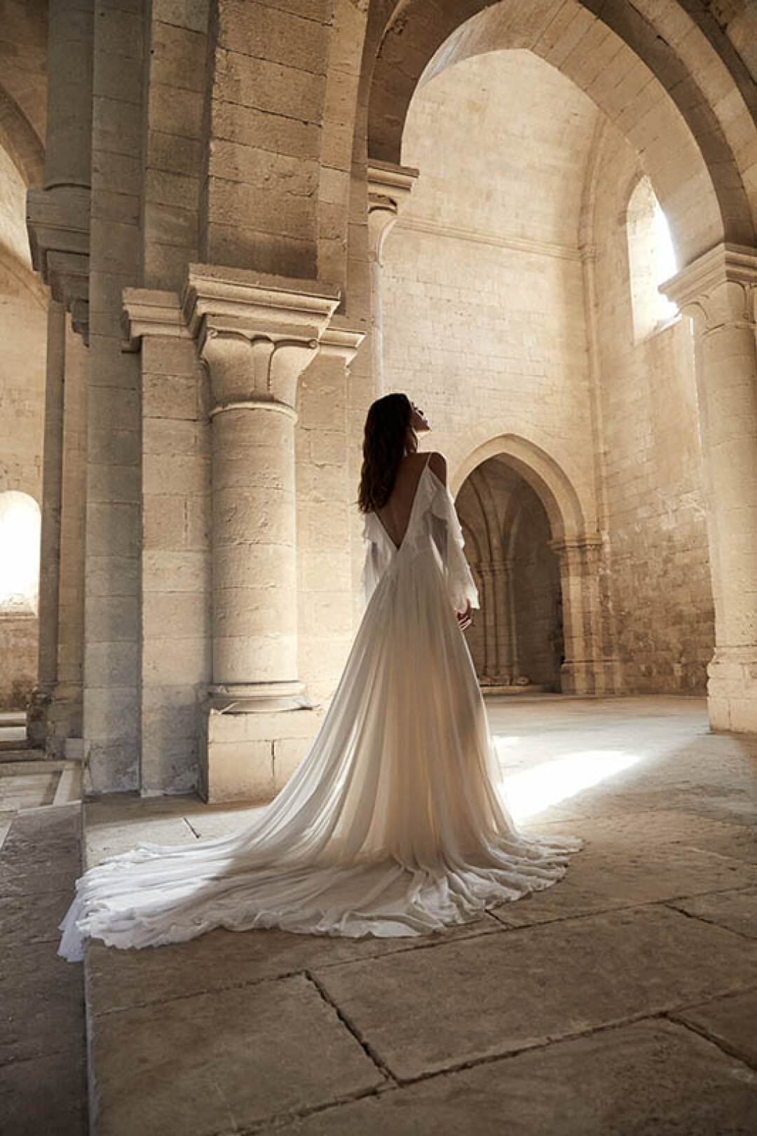 Никакого консерватизма и никаких условностей, зато максимум diversity. Vian создают свадебные платья для невест вне зависимости от их внешности, сексуальной ориентации и возраста. Марка позиционирует свои образы, как экстравагантные. Тут можно найти распашную и очень объемную юбку, шелковую рубаху, передник из репса, платье с огромными рукавами-фонариками (скорее даже фонорями!), платье-кейп, а еще фату, расшитую бахромой или перьями. И это очень красиво! Бонус: у невесты есть возможность вышить на платье значимое для нее слово, фразу или знак.