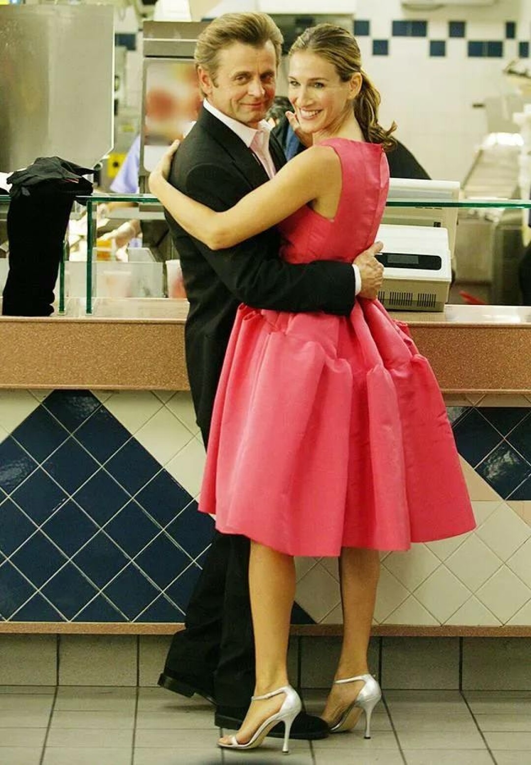 Так, в красном платье в горох и с фирменным пакетом Макдоналдс в руках Кэрри провожала мистера Бига в Париж. А в одном из самых запоминающихся образов сериала - платье цвета фуксия от Oscar de la Renta - героиня танцует со своим русским любовником Александром Петровским в интерьерах ресторана быстрого питания.