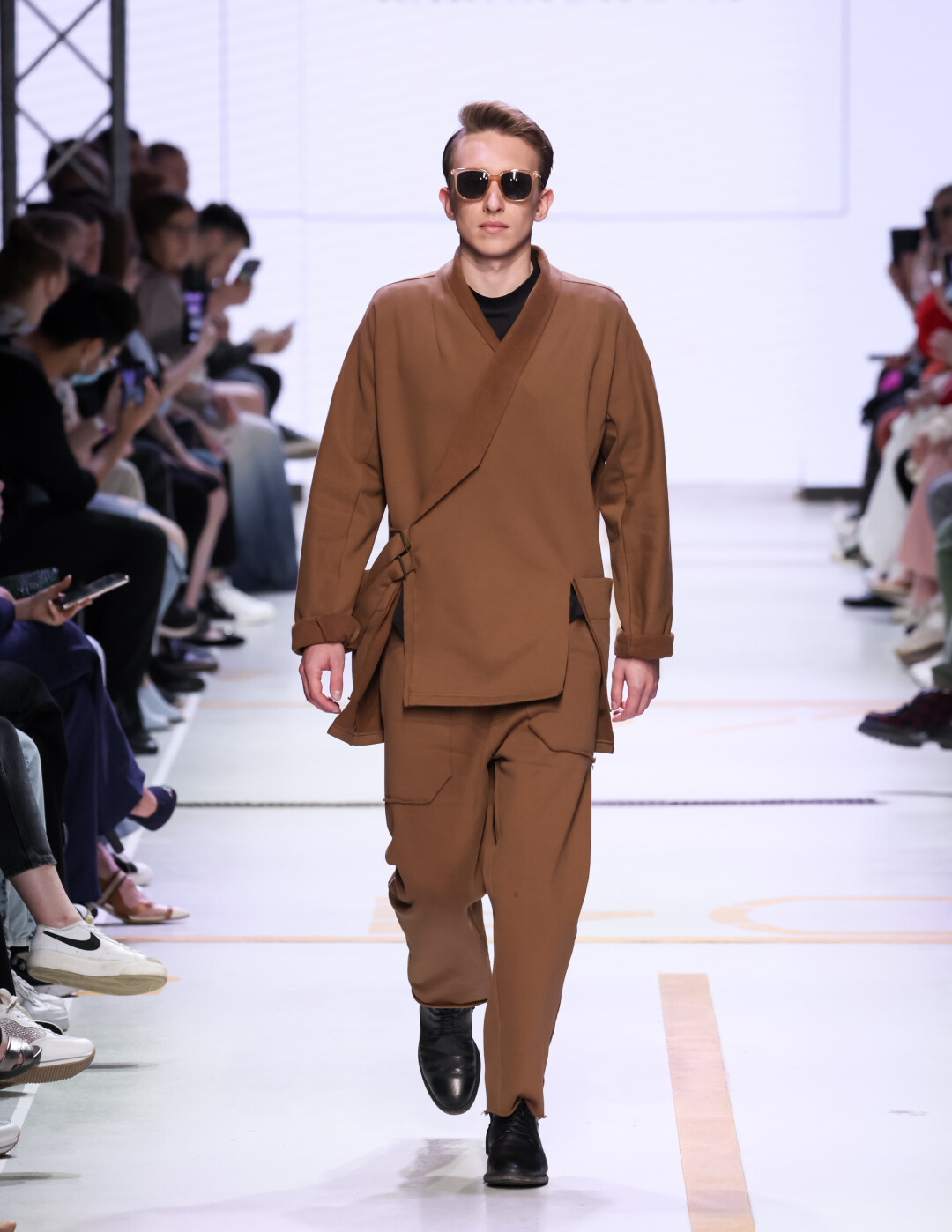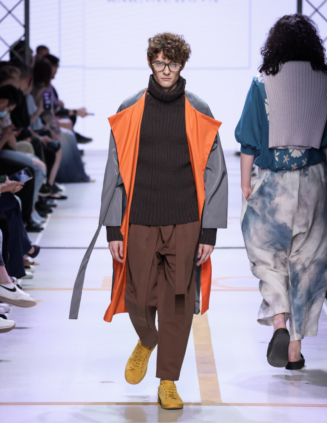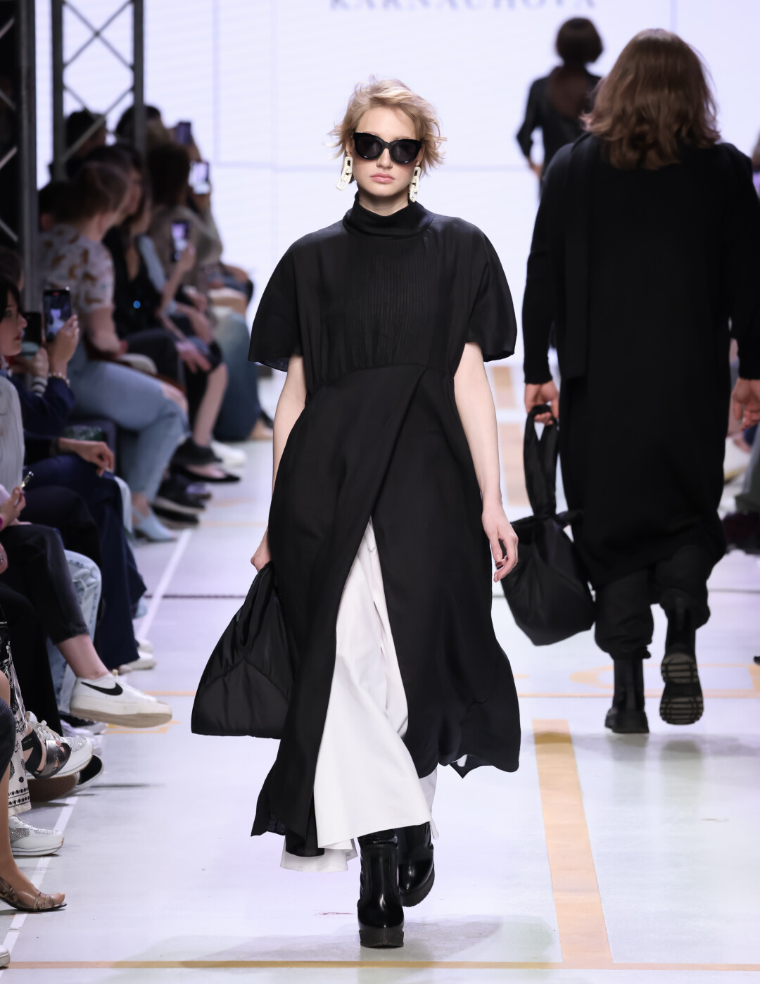 Коллекция бренда Lena Karnauhova под названием Silence («Тишина») построена на свободных силуэтах и струящихся тканях и выдержана в спокойных базовых оттенках, которые были точечно разбавлены ярко-розовым и оранжевым цветами. Через простые и понятные вещи дизайнер хотела донести до зрителя идею внутреннего комфорта, построенного на тишине. В коллекцию вошла целая капсула струящихся платьев, мужские и женские брючные костюмы, акцентное дутое пальто, ансамбли с этническими мотивами, навевающими дух кочевнической свободы.