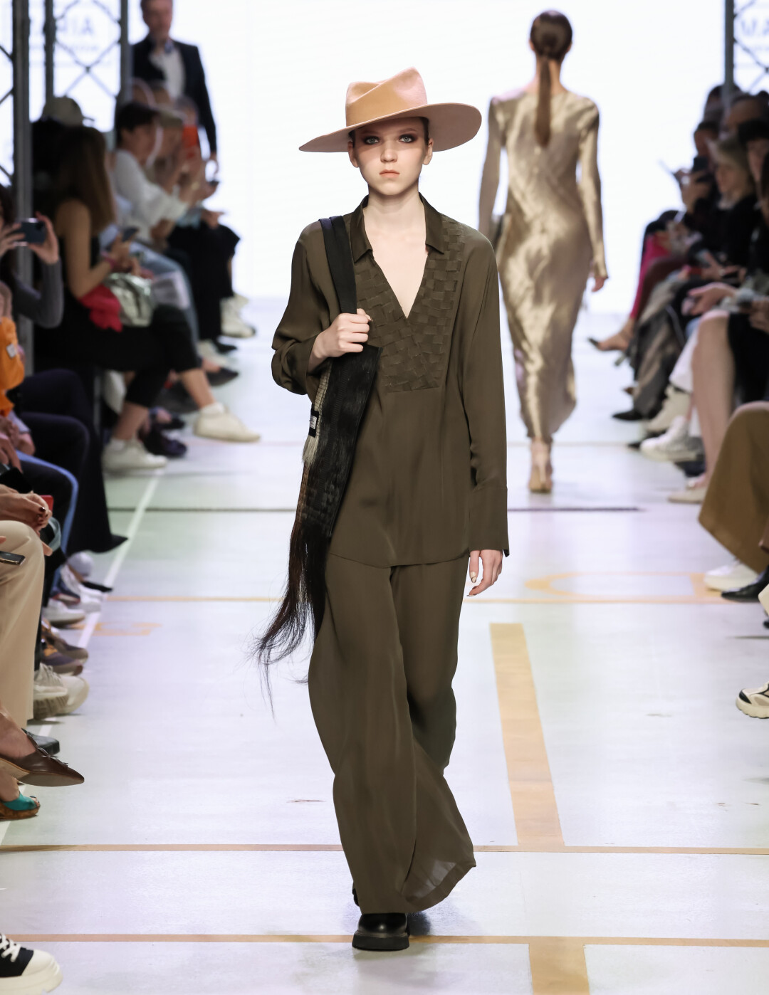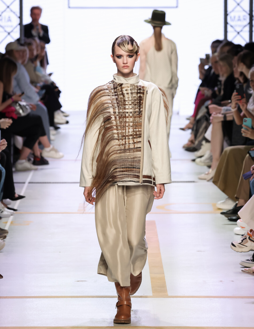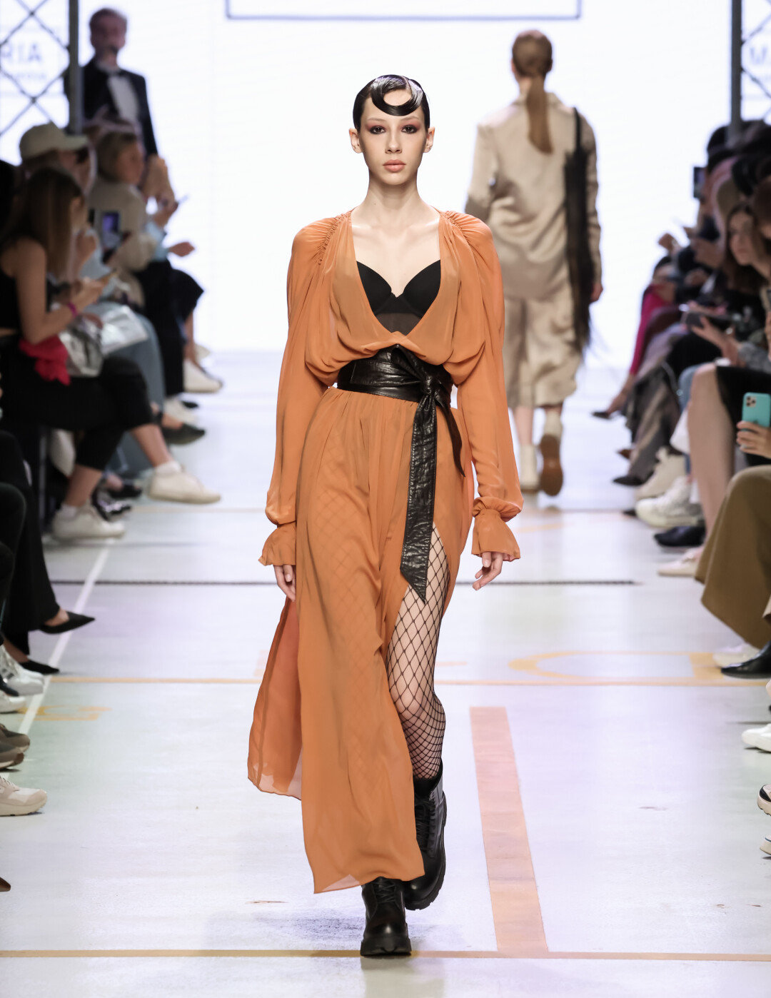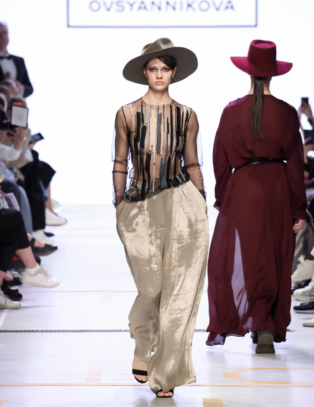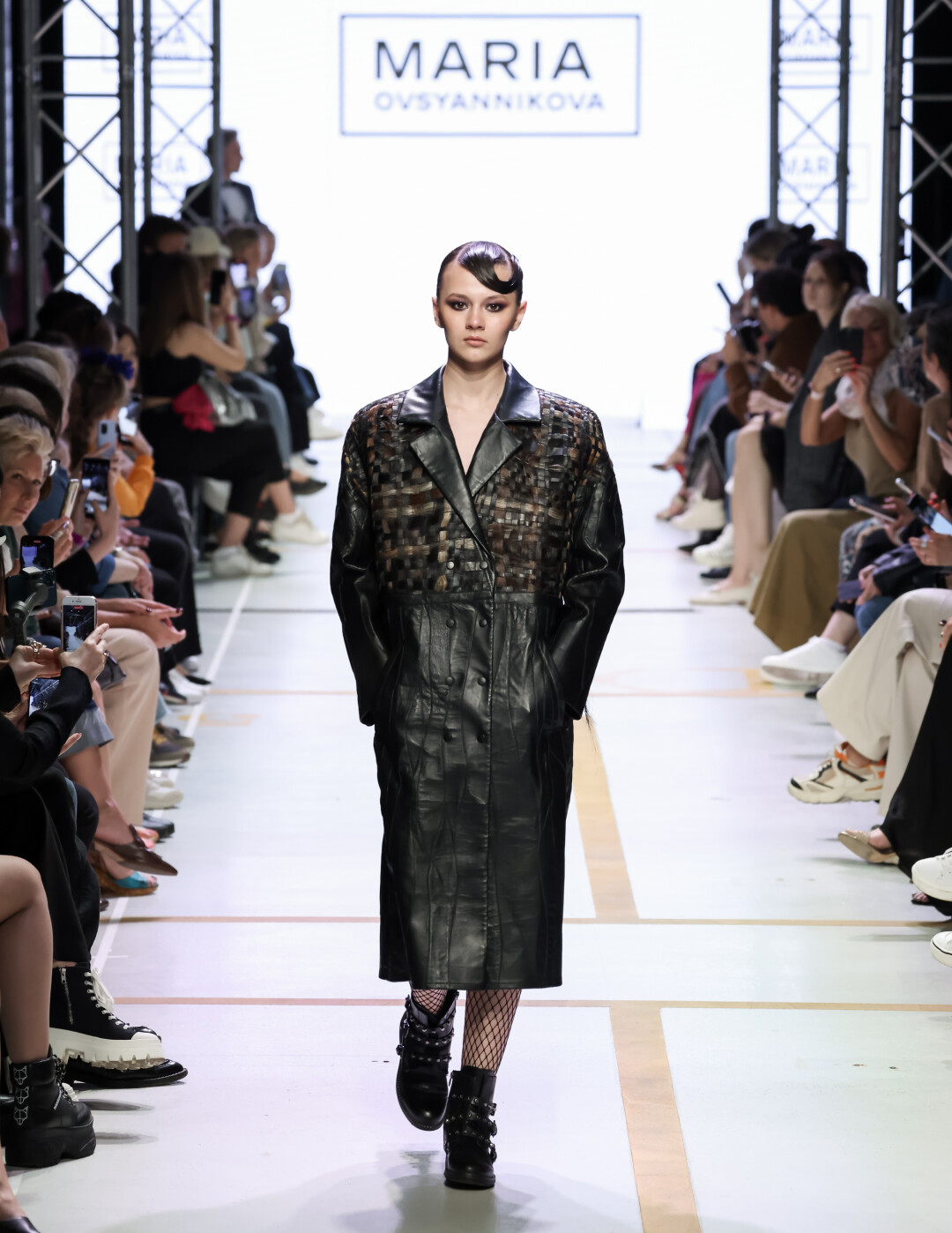 Новая коллекция дизайнера Марии Овсянниковой была вдохновлена конным спортом. В линейке воздушные полупрозрачные ткани гармонично соседствовали с грубой кожей и акцентной обувью. Ключевыми аксессуарами стали широкополая шляпа и плоские сумки, декорированные вплетенными конскими волосами. В коллекции присутствовали как экстравагантные вещи вроде кожаного пальто с фактурным плетением, так и вполне понятные платья макси из струящегося шелка, кожаные мини-юбки, пиджаки в мужском стиле.