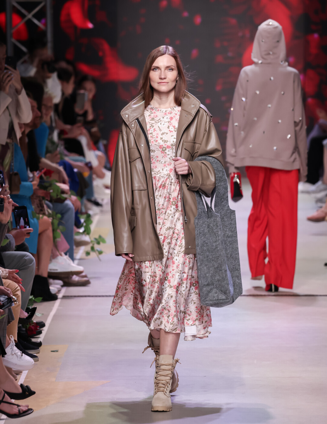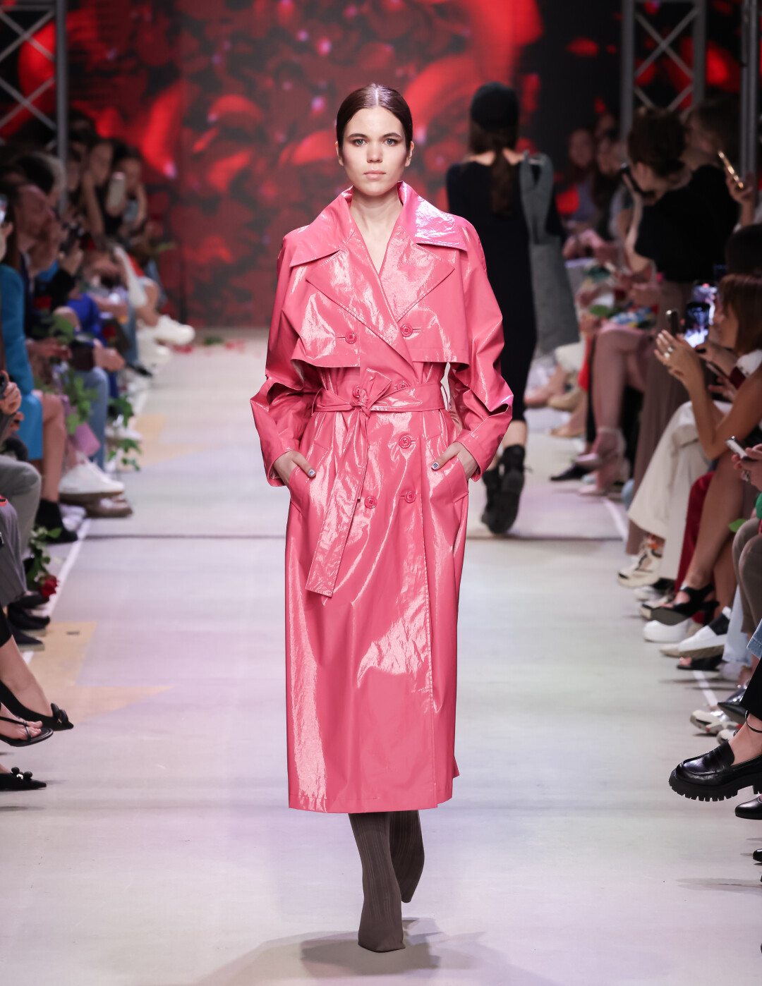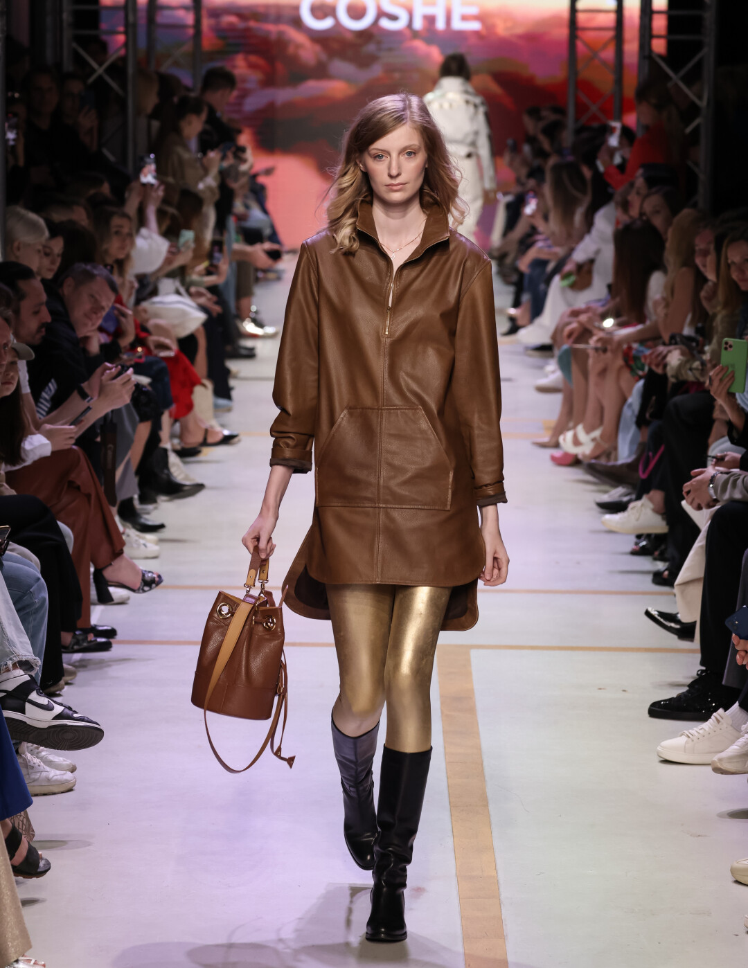 В новой коллекции дизайнер бренда COSHÈ сделала ставку на кожаные вещи: жилеты, юбки, мужские и женские бомберы, куртки, платья соседствовали с отличными по фактуре вещами, что создавало сбалансированный контраст. Кожа также нашла свое проявление в виде оторочек на платьях, пиджаках, куртке и классическом тренче. Яркими акцентами в коллекции стали неоново-зеленый спортивный костюм, изумрудный кожаный бомбер и ярко-голубой брючный костюм. Финальным аккордом показа стало белое платье в пол с открытой спиной из струящейся ткани, которое вполне может стать свадебным нарядом для современной невесты.