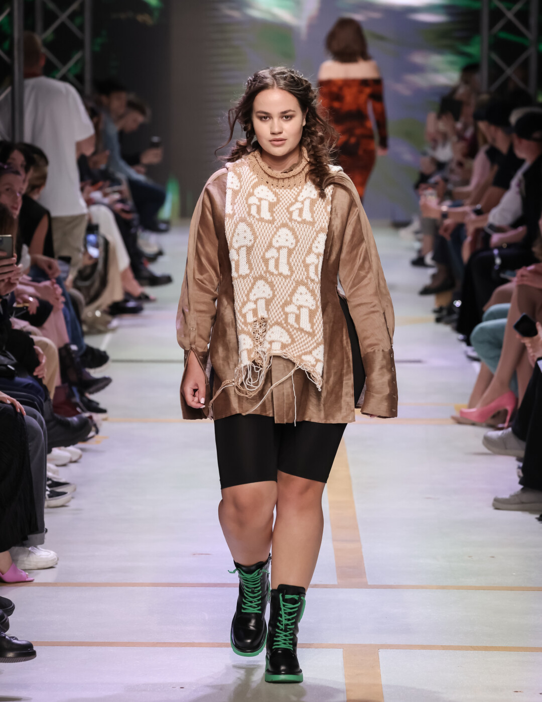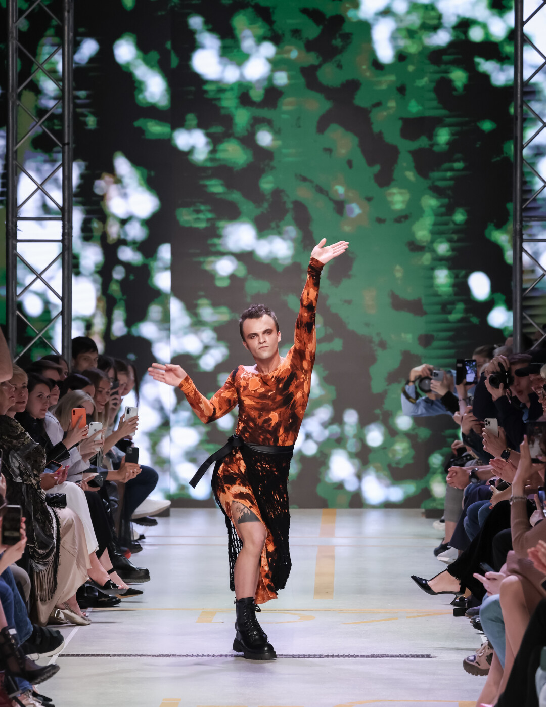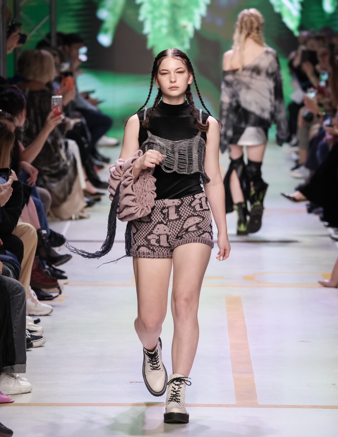 Коллекция бренда DAS – творение трех дизайнеров, которые решили объединиться и подготовить совместную апсайкл-коллекцию. Новая линейка была вдохновлена эстетикой праздника Ивана Купалы. В нее вошли вязаные вручную вещи, которые, словно паутина, оплетали тела моделей. Некоторые образы дополняли трикотажные и кожаные «гетры». Облегающие платья подружились с вязаными фартуками, а лоснящиеся мужские рубашки – с трикотажными манишками.