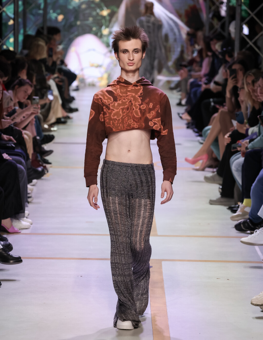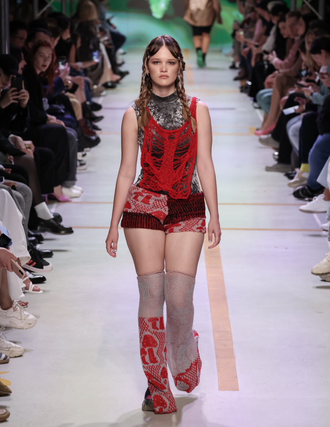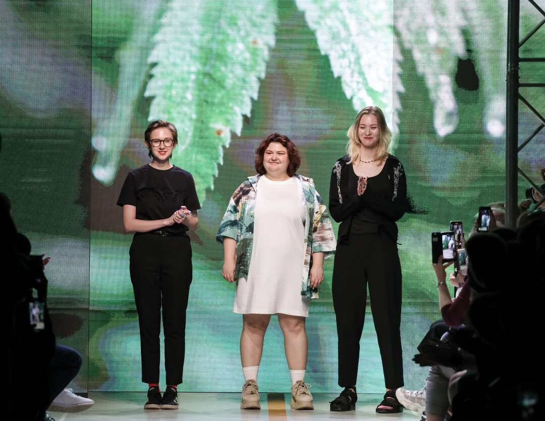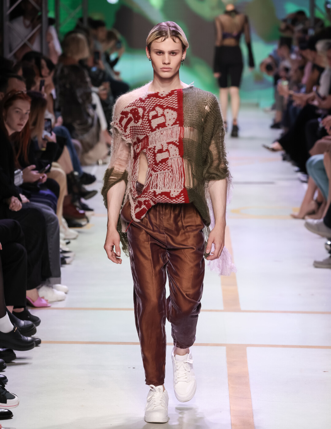 Коллекция бренда DAS – творение трех дизайнеров, которые решили объединиться и подготовить совместную апсайкл-коллекцию. Новая линейка была вдохновлена эстетикой праздника Ивана Купалы. В нее вошли вязаные вручную вещи, которые, словно паутина, оплетали тела моделей. Некоторые образы дополняли трикотажные и кожаные «гетры». Облегающие платья подружились с вязаными фартуками, а лоснящиеся мужские рубашки – с трикотажными манишками.