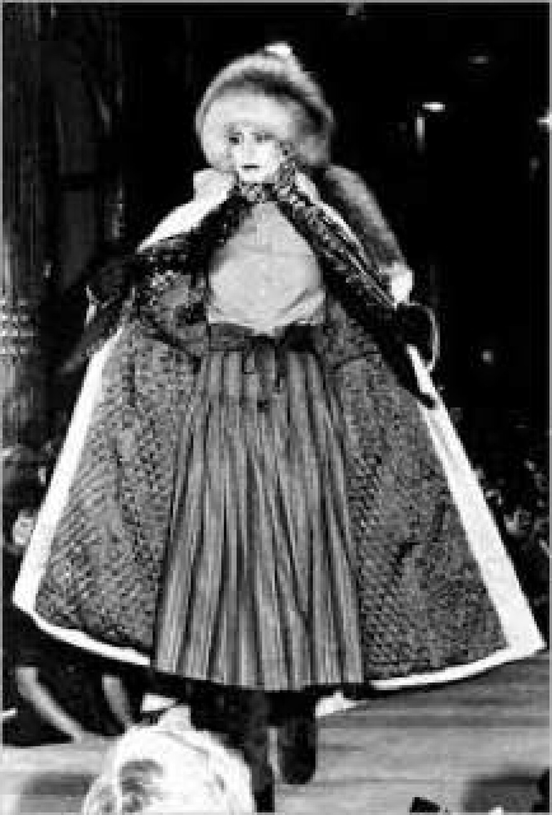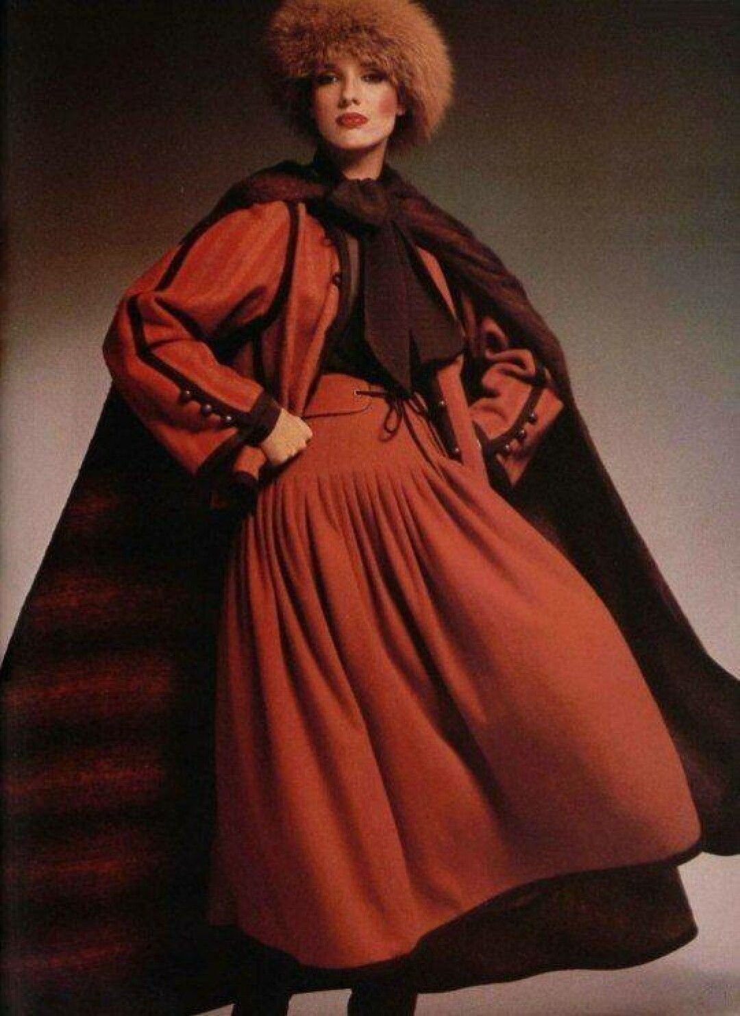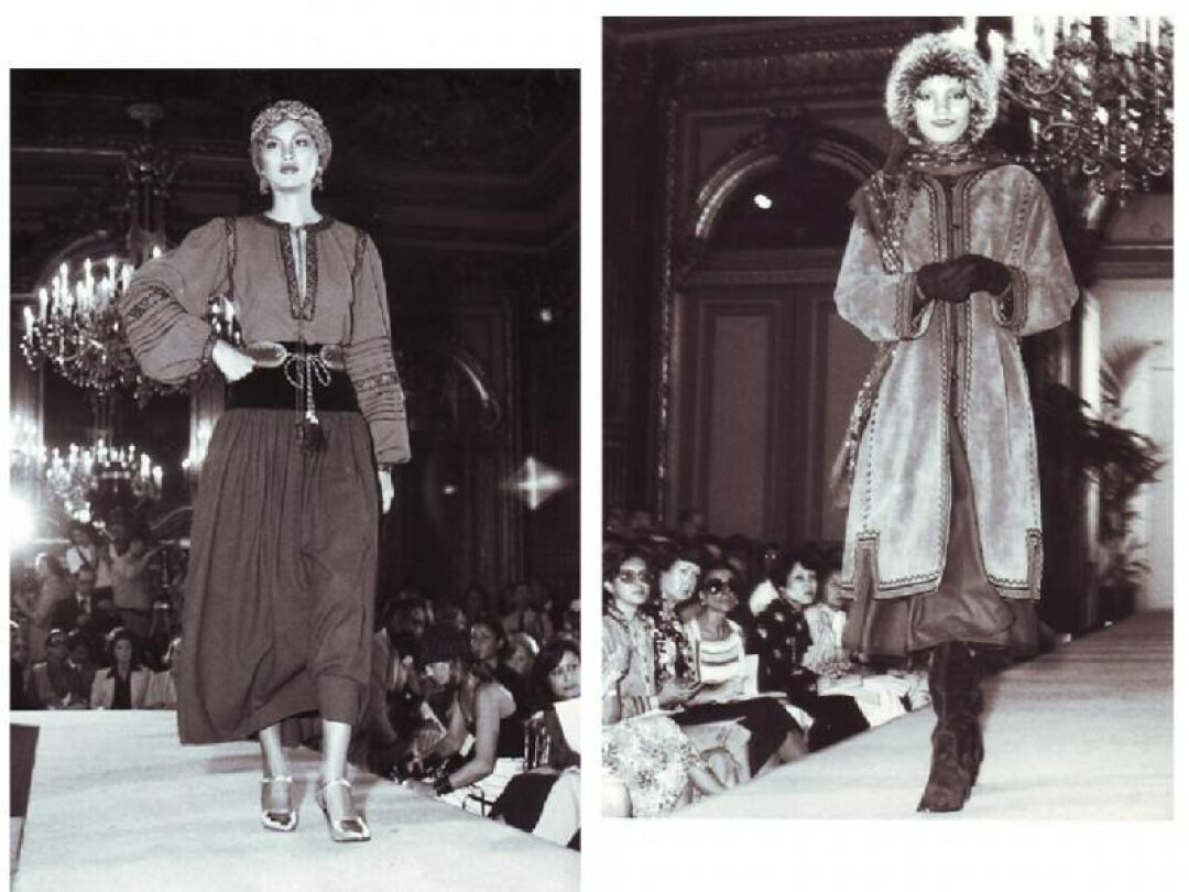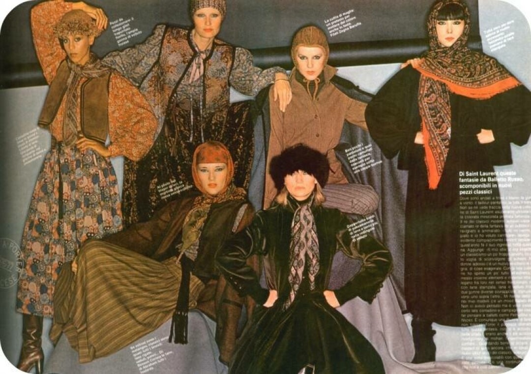 В 70-е русскую коллекцию выпустил Ив Сен-Лоран. Показ «Opera- Ballets russes»* стал первым после Поля Пуаре, где дизайнер в открытую обращался к русской эстетике. После показа многие дизайнеры вновь подхватили русскую тему.