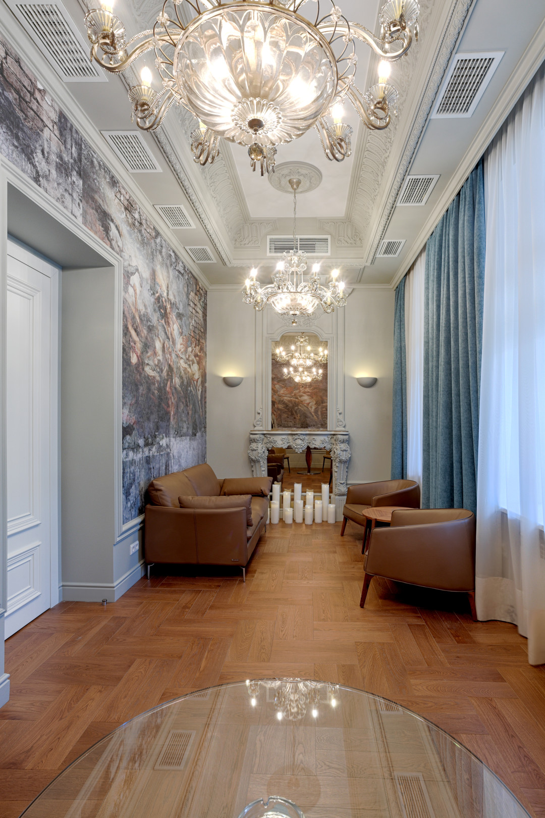 Когда мы впервые попали на объект и поняли, с каким зданием нам предстоит работать, то сразу решили, что место задает стиль. Исторический центр города, одно из самых высоких зданий на улице Ленина, красивое и статное. Логично, что и внутри все должно соответствовать. Основные задачи, которые требовали решения: наличие зоны спа с бассейном, установка лифта в историческое здание, организация входной группы, подъезда в отель. По нормативам «пяти звезд» существует требование: гость, подъехавший в отель, должен попасть в него под козырьком, чтобы во время дождя на него не попало ни капли. Все это мы исполнили.