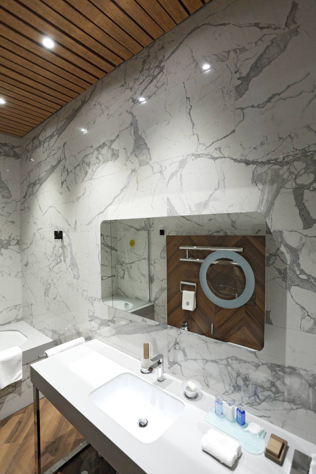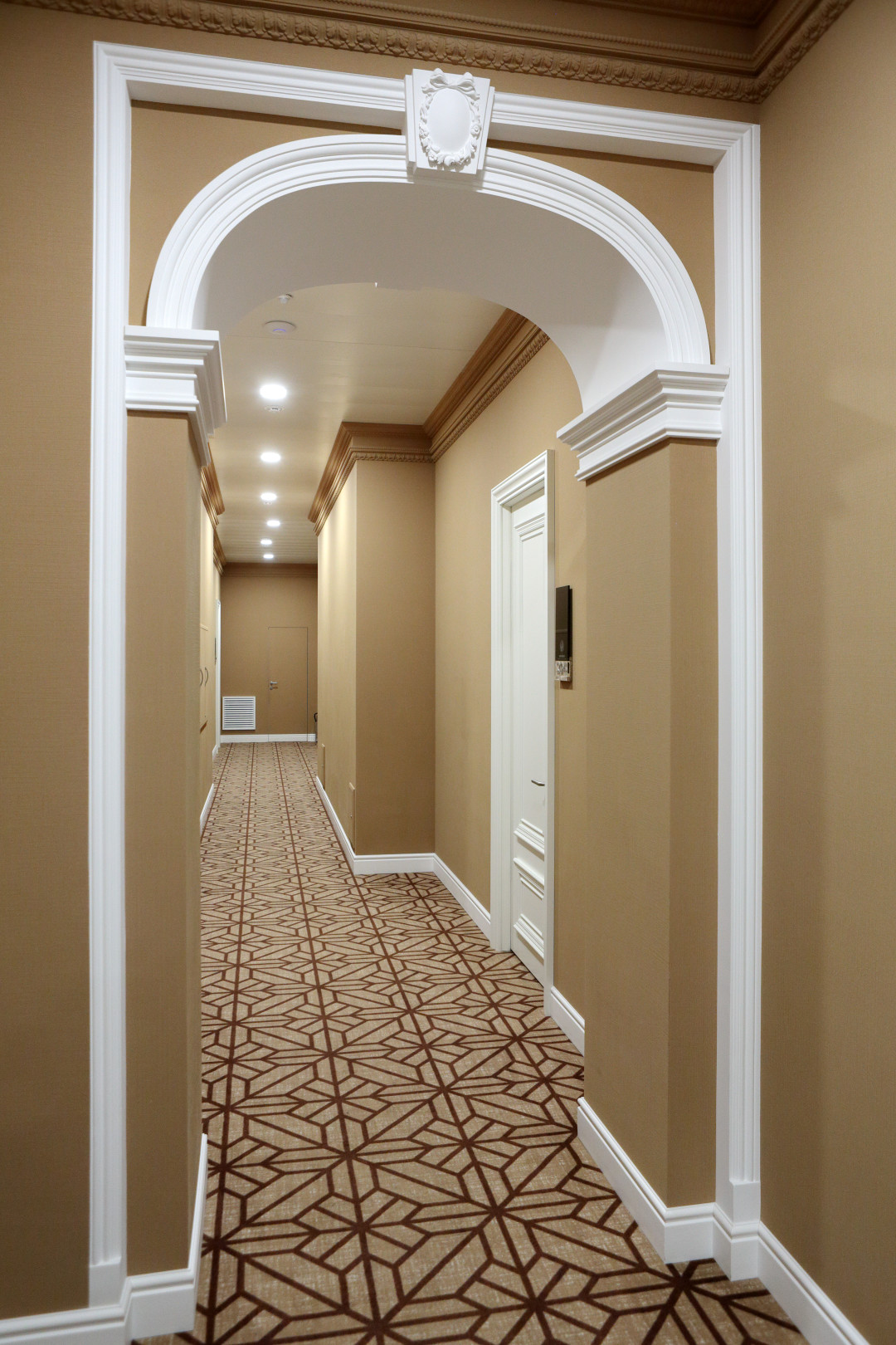 Однозначно я бы не очерчивала границу стиля, мы использовали прием, когда в исторический объект внедряются более современные минималистичные формы. У нас таким образом были выполнены санузлы. Если посмотреть интерьер любого номера, можно заметить, что в нем преобладает лепнина, все выполнено в светлых тонах, ближе к стилю фасада отеля. А санузел словно кубик, инородное тело, внедренное в помещение. Он окрашен современными метализированными красками, установлено техническое освещение, зеркальные двери в алюминевой раме . В зоне ресепшн мы так же использовали этот прием. Например, в классические арки помещены минималистичные решения отделки стен.