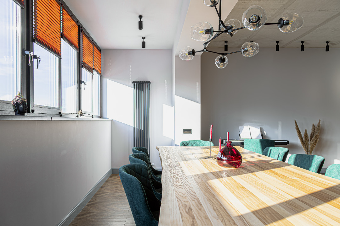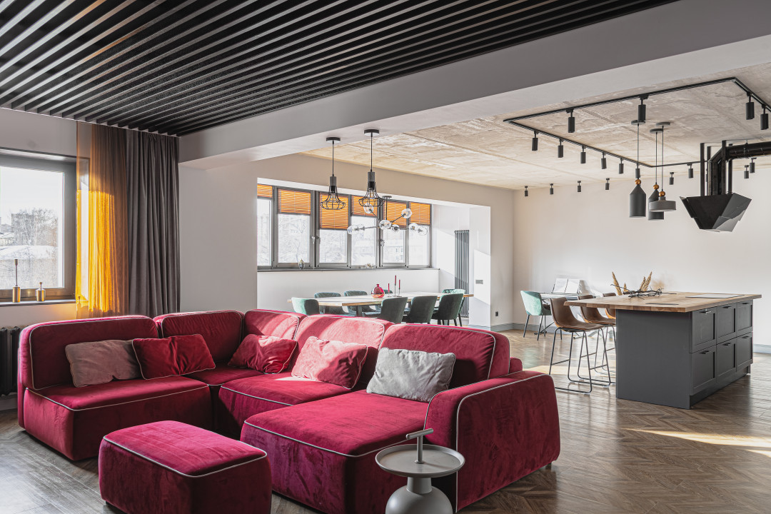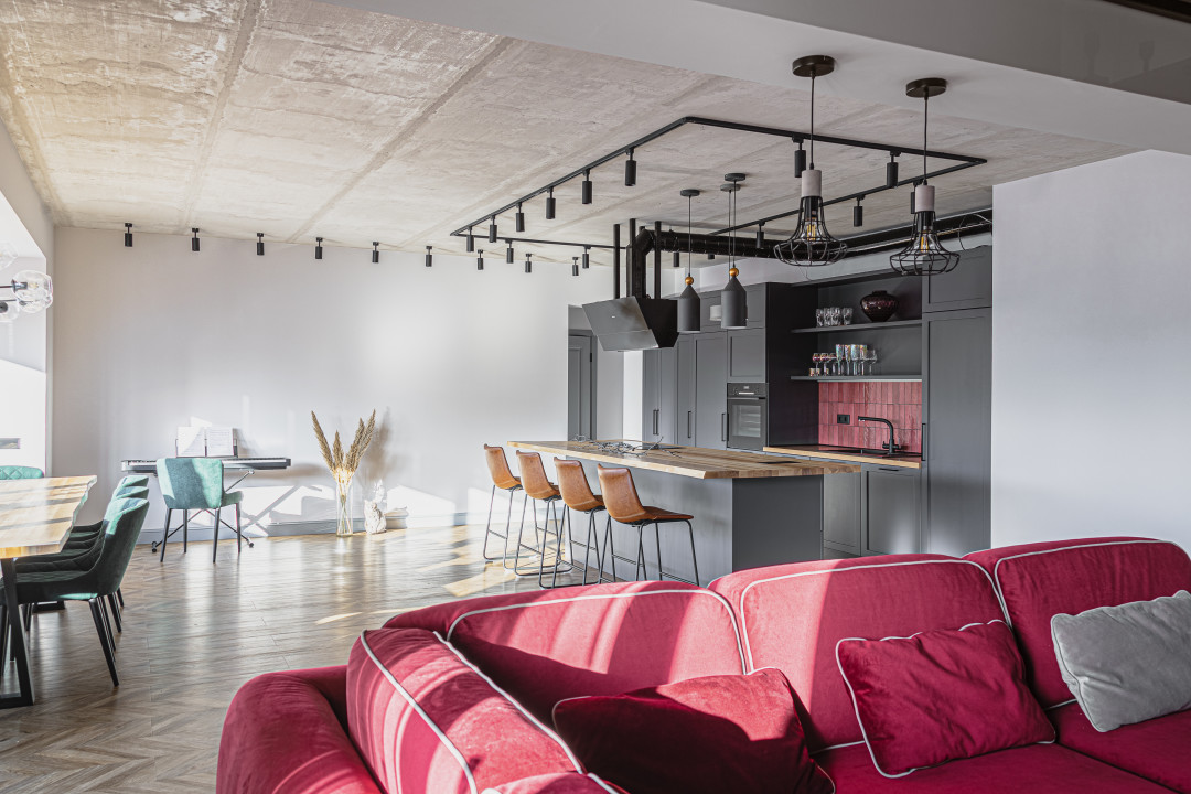Для достижения этих отчасти противоречивых целей мы выбрали актуальный стиль «лофт» и спланировали сочетание в квартире холодного бетона и металла с деревом, кожей и мягким бархатом. Так появился нужный баланс между строгостью и домашним теплом