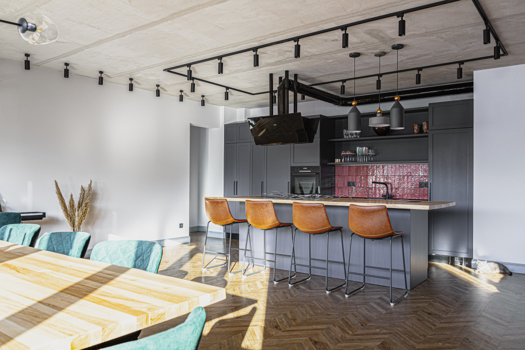 Кухня занимает большую часть общего пространства, но мы не стали делать ее незаметной, а, наоборот, выделили эту зону с помощью яркого кухонного фартука, светильников, стульев и барной стойки. Одинаковое напольное покрытие елочкой подчеркивает единство и однородность этого пространства.