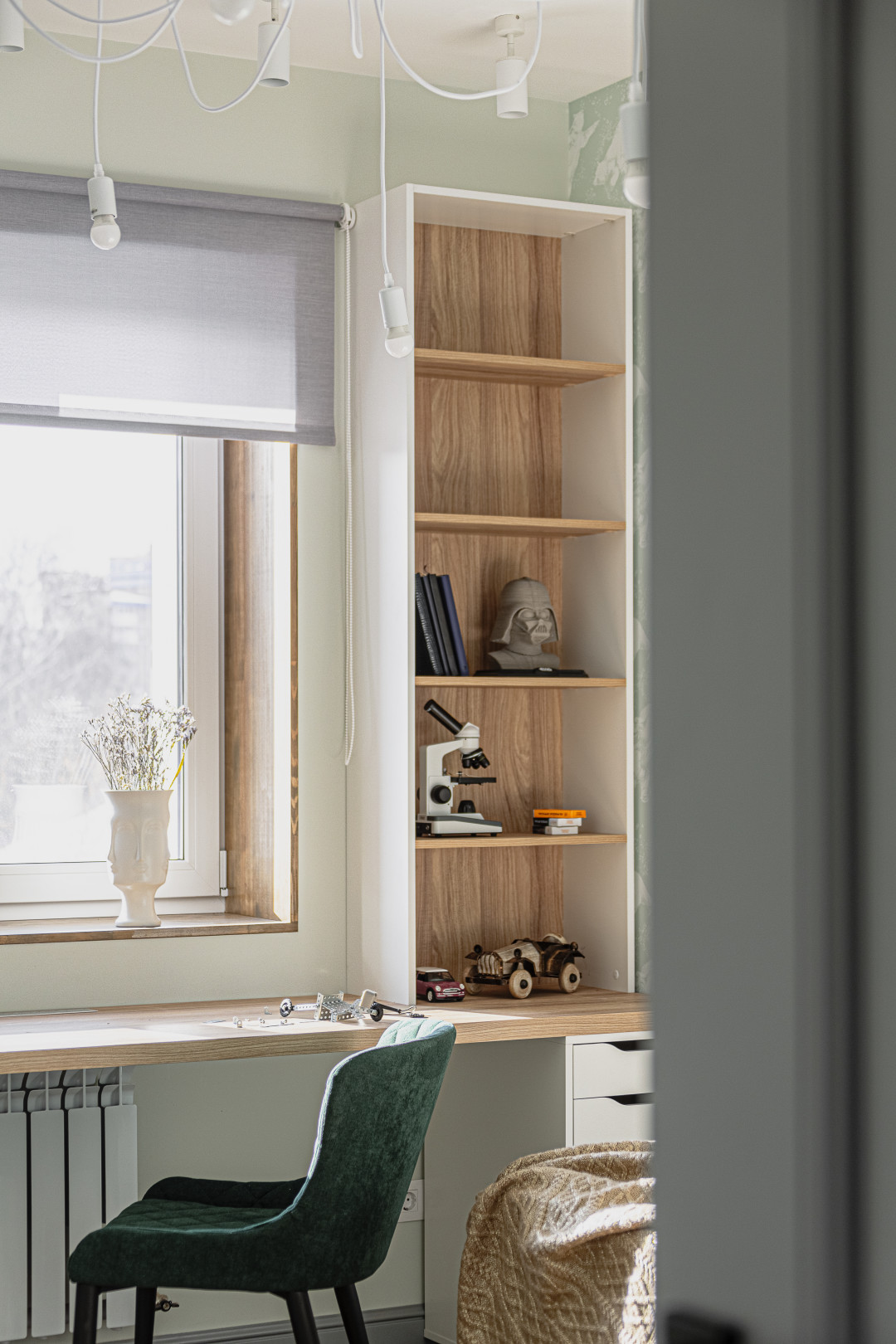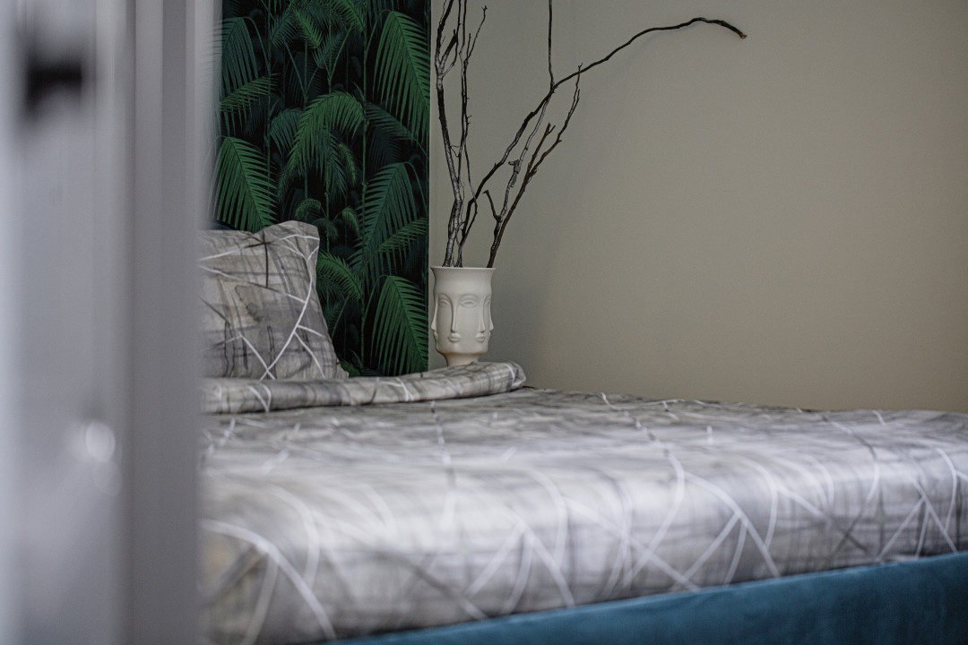 Цветовому решению интерьера с самого начала мы уделили максимум внимания — и в отделке, и в подборе мебели и аксессуаров. Идея была в том, чтобы выстроить цветовой баланс: акцентная охра, пальмовая зелень, марсала на общем фоне французского серого смотрятся очень лаконично