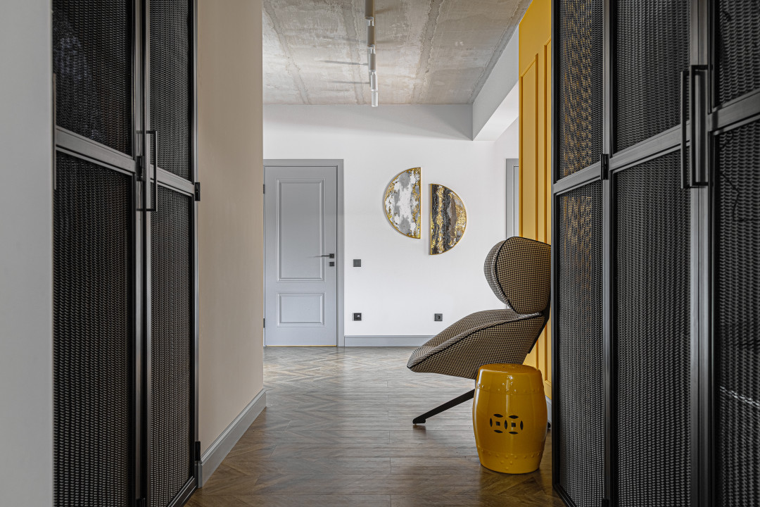 Я рада, что смогла использовать в интерьере колоритные цвета, потому что не каждый заказчик решится на такие насыщенные оттенки. Ярко-горчичный цвет в коридоре появился неспроста — мы с заказчицей захотели добавить в проект солнечных красок. А на контрасте с черными глянцевыми дверцами шкафов из панцирной сетки этот цвет и вся входная группа смотрятся особенно выигрышно.