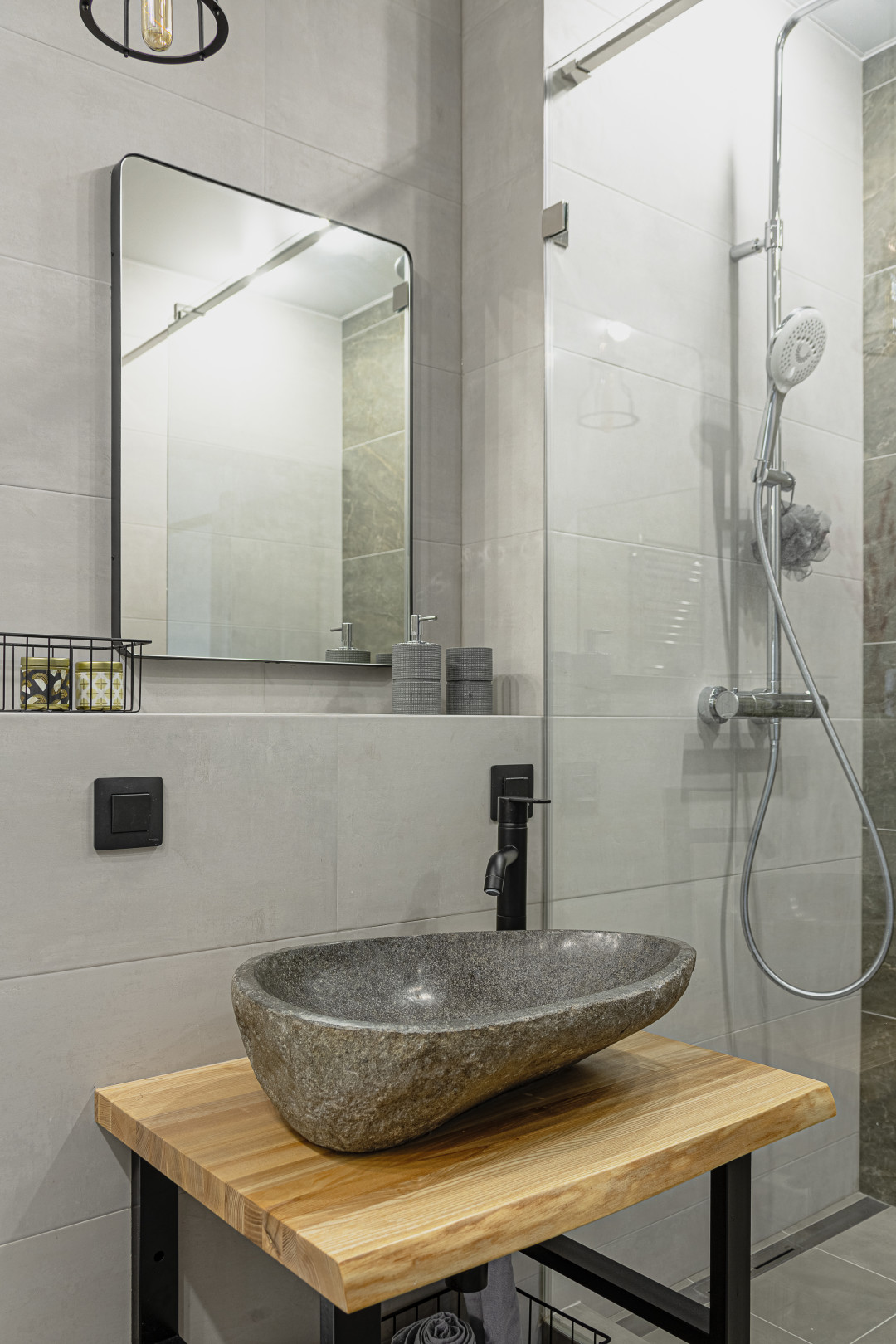 Фактурный бетонный потолок был специально нанесен декораторами. Для поддержания стиля «лофт» мы изначально хотели оставить плиты от застройщика, но их ужасное состояние и большие перепады высот не позволили это сделать. От идеи не отказались, и теперь вряд ли кто может догадаться, что на потолке всего лишь искусная имитация.