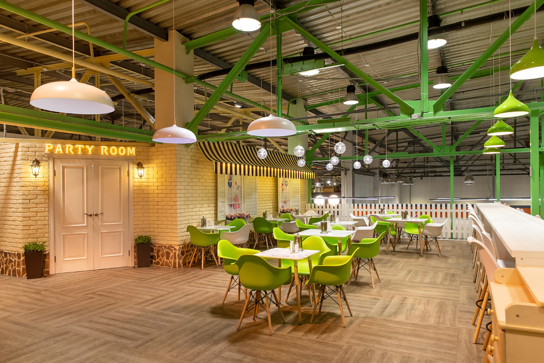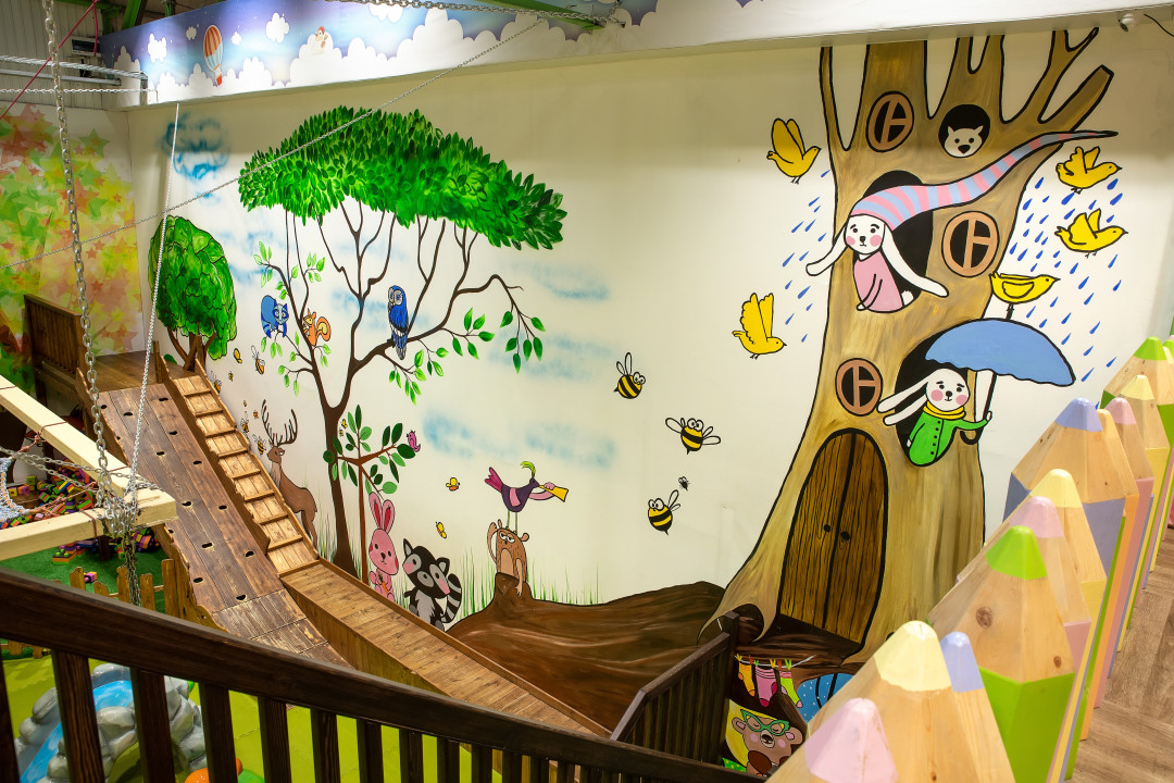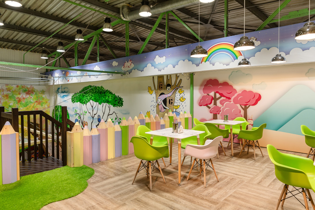Кафе похоже на импровизированный лес с нарисованными деревьями и скворечниками из дерева. Комната для проведения дней рождений рассчитана на несколько возрастных групп — в ней можно проводить игры, устраивать представления на сцене, организовывать фуршеты и чаепития за большим столом.