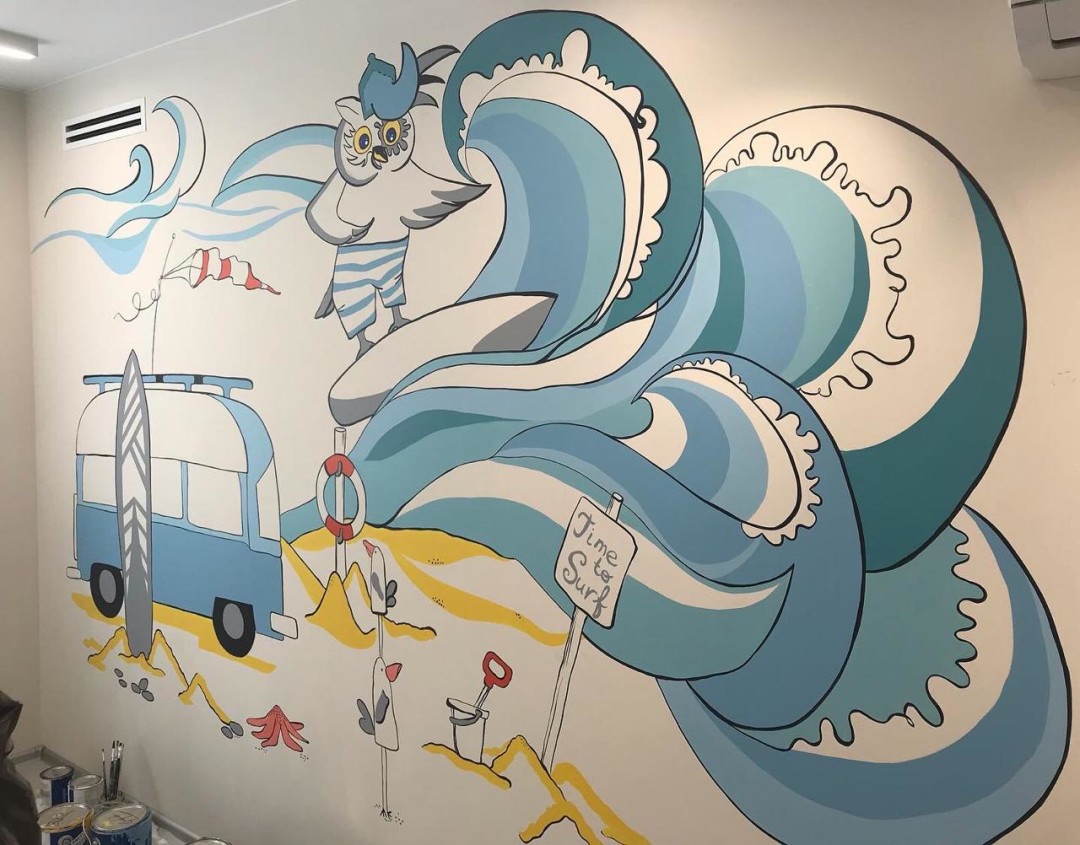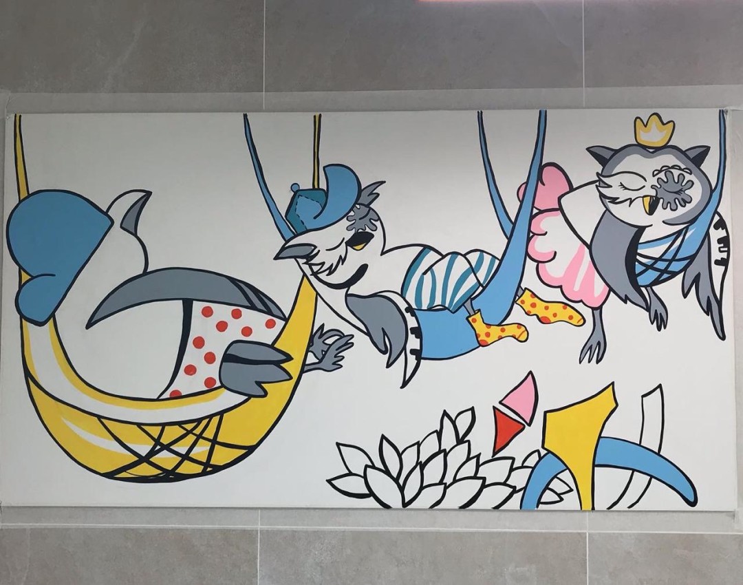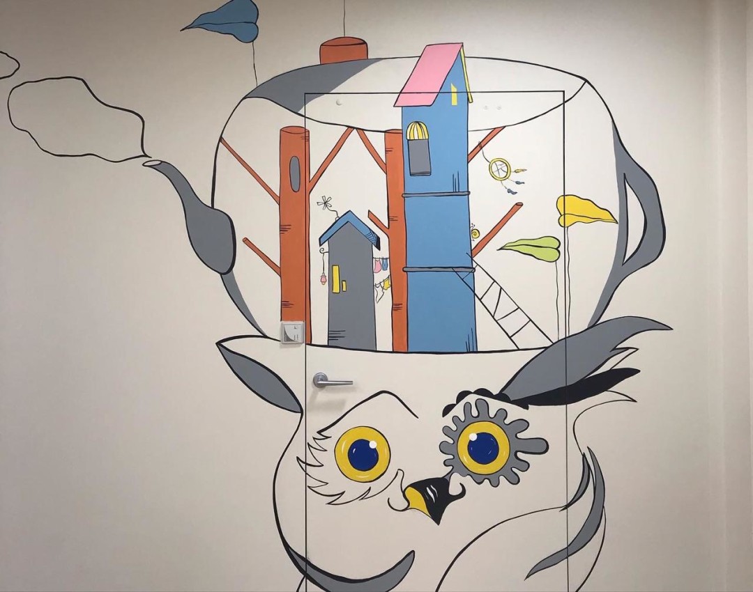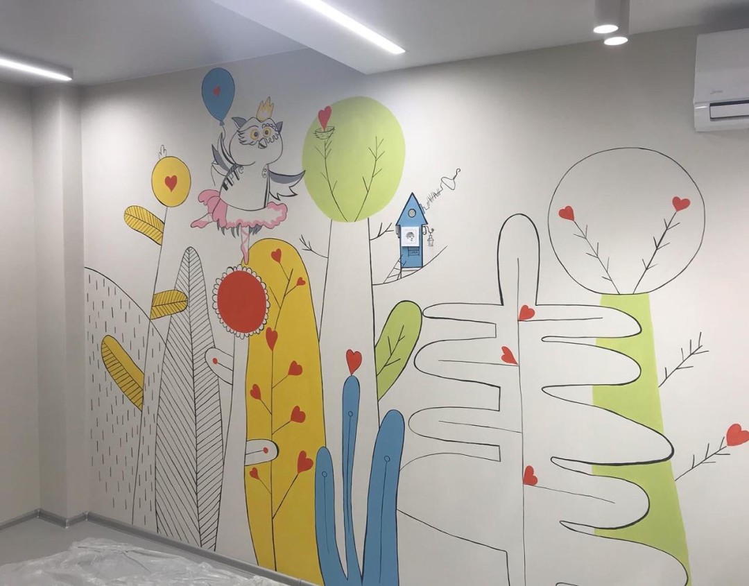 Один из новых проектов — роспись стен в клинике. Задача состояла в том, чтобы украсить стены так, чтобы дети не чувствовали себя, как в больнице, была дружеская и игривая атмосфера. Елена создала легкие, но интересные рисунки, персонажа – хранителя детского счастья и хорошего настроения. Эту работу хочется разглядывать, историю – досочинить, а на фоне стен – фотографироваться. Получился рукотворный интерактивный арт-объект.
