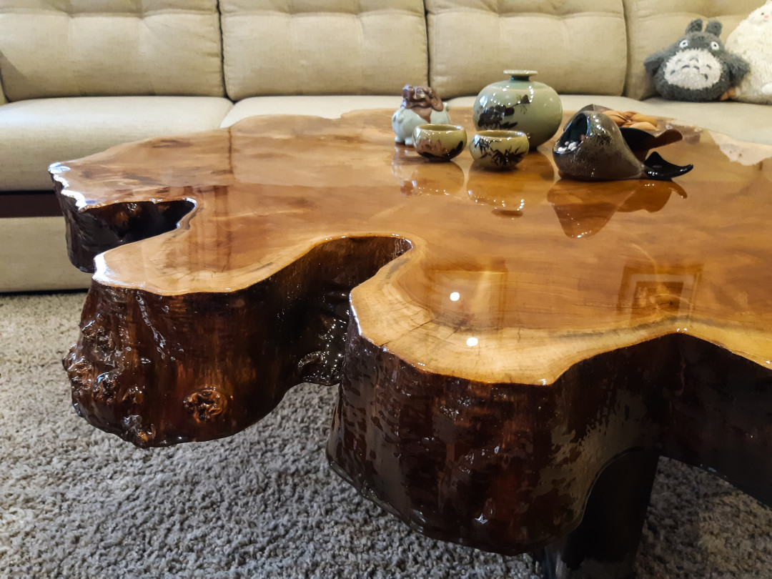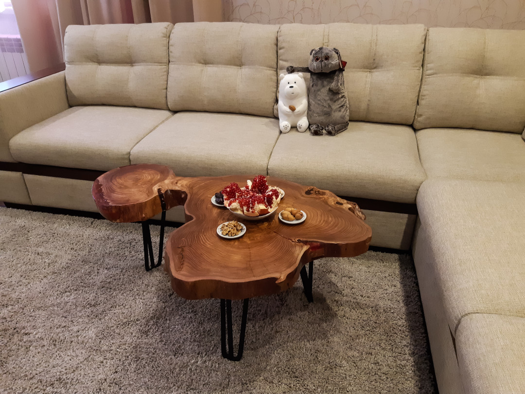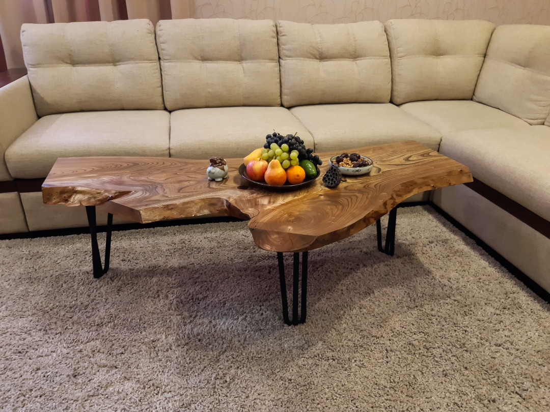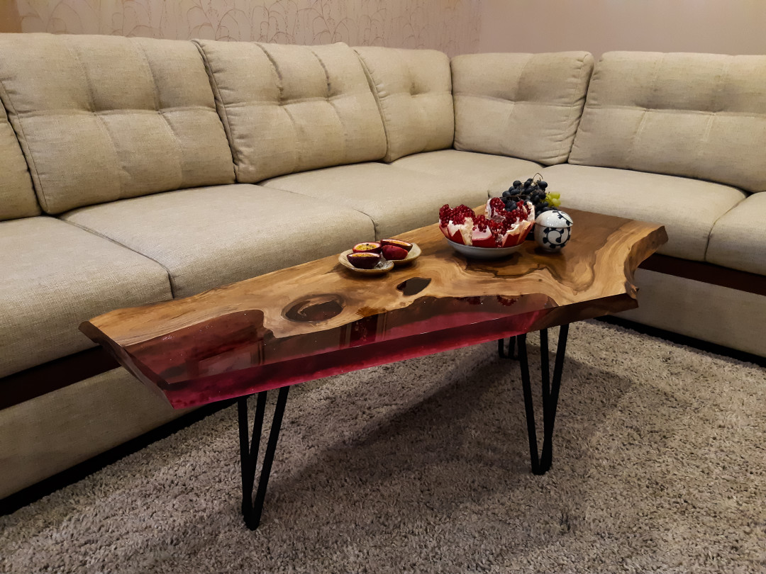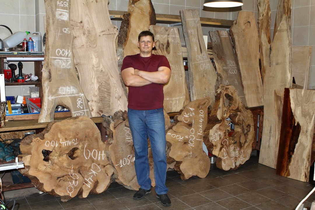 Мастер работает как с массивом дерева, так и с мебельным щитом. Также при желании заказчика в работе могут быть использованы: древние окаменелости, кристаллы, перламутр, янтарь, люминофор.