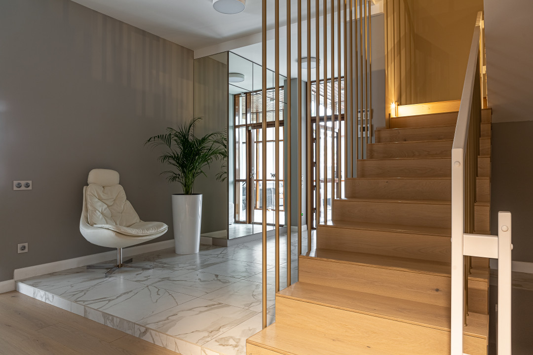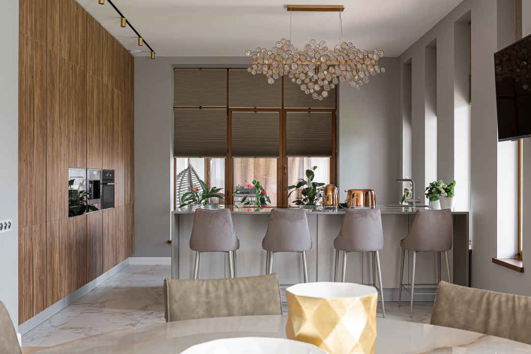 Кухня и гостиная совмещенные. В наше время это практически главное пространство — здесь мы проводим большую часть времени, готовим еду и общаемся. Почти во всем доме у шкафов и тумбочек нет ручек — все они с захватами или «пуш-апом» — это элегантно и в то же время не марко. Гостиная плавно перетекает к лестнице на второй этаж. Ступени и планки сделали из паркета, а ограждения — металлические под «латунь».