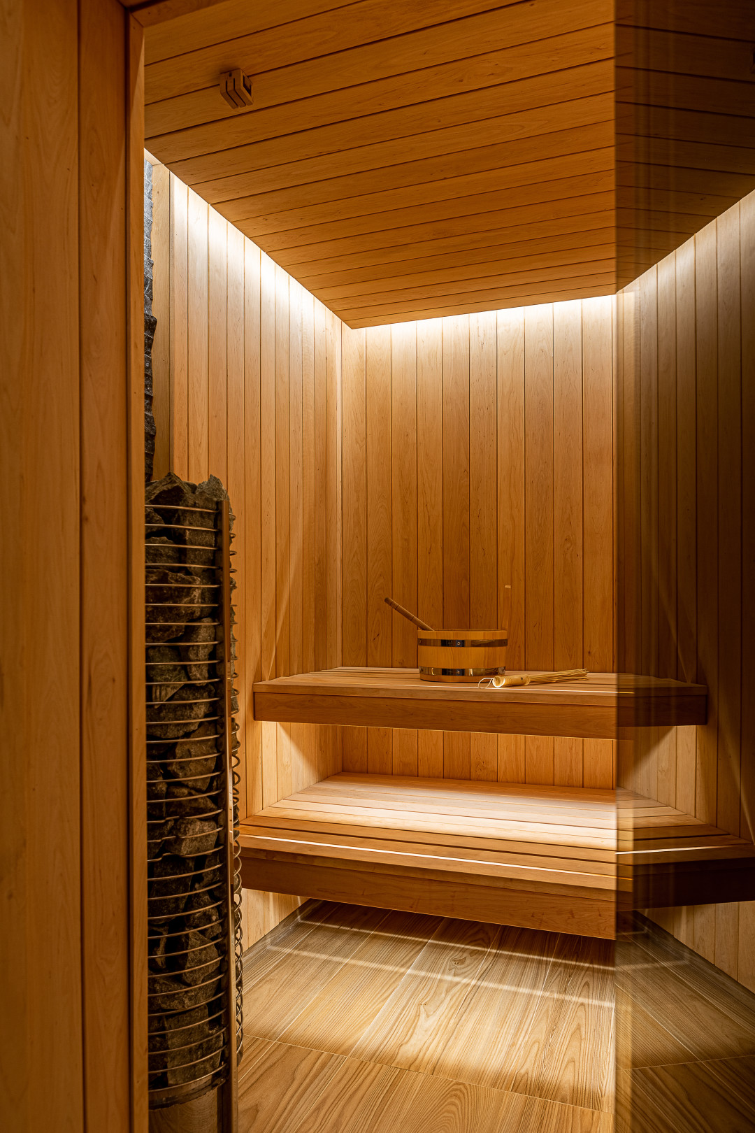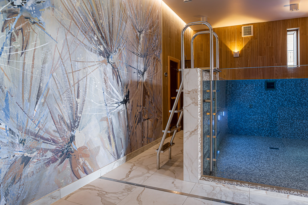 Спа-зону мы немного изменили. У прежних владельцев дома здесь стояла фитобочка, но это — на любителя. На ее месте появился бассейн. Одна из его стенок стеклянная — можно видеть, как купаются дети, или сделать оригинальное фото. На стене — фреска с одуванчиками, она выглядит, как ручной рисунок. Также мы сделали небольшую сауну, полки без опор, с подсветкой.