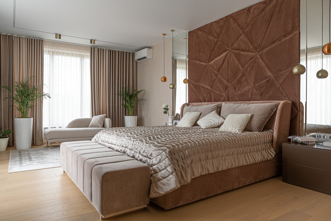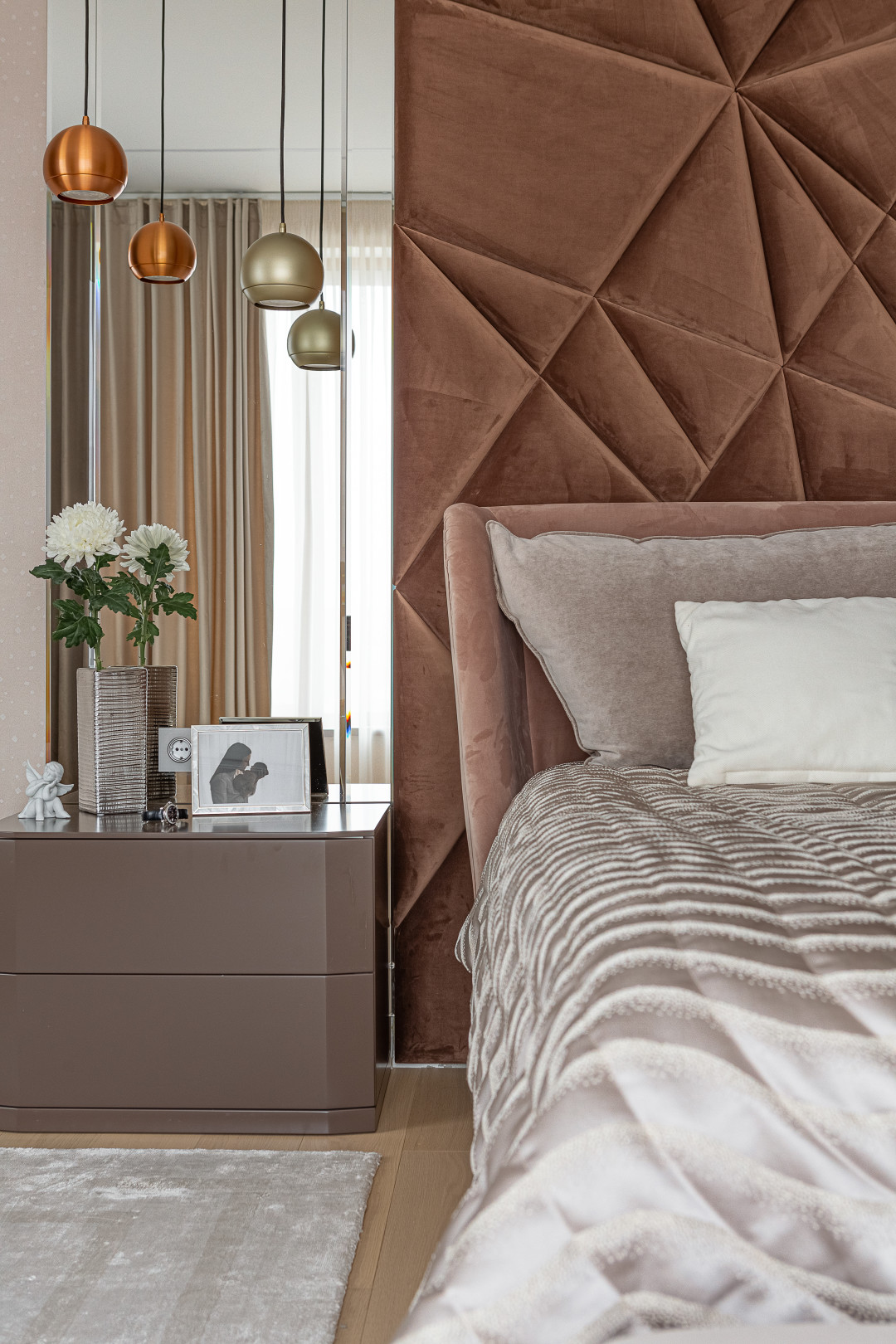 Обустроили просторную спальню с мягкой «плюшевой» стеной. Со светильниками работали с удовольствием: центральный свет весь встроенный — получился нереально красивым и образным. Еще одно дизайнерское решение — зеркала, переходящие в тумбочку. Они расширяют пространство и функциональны.