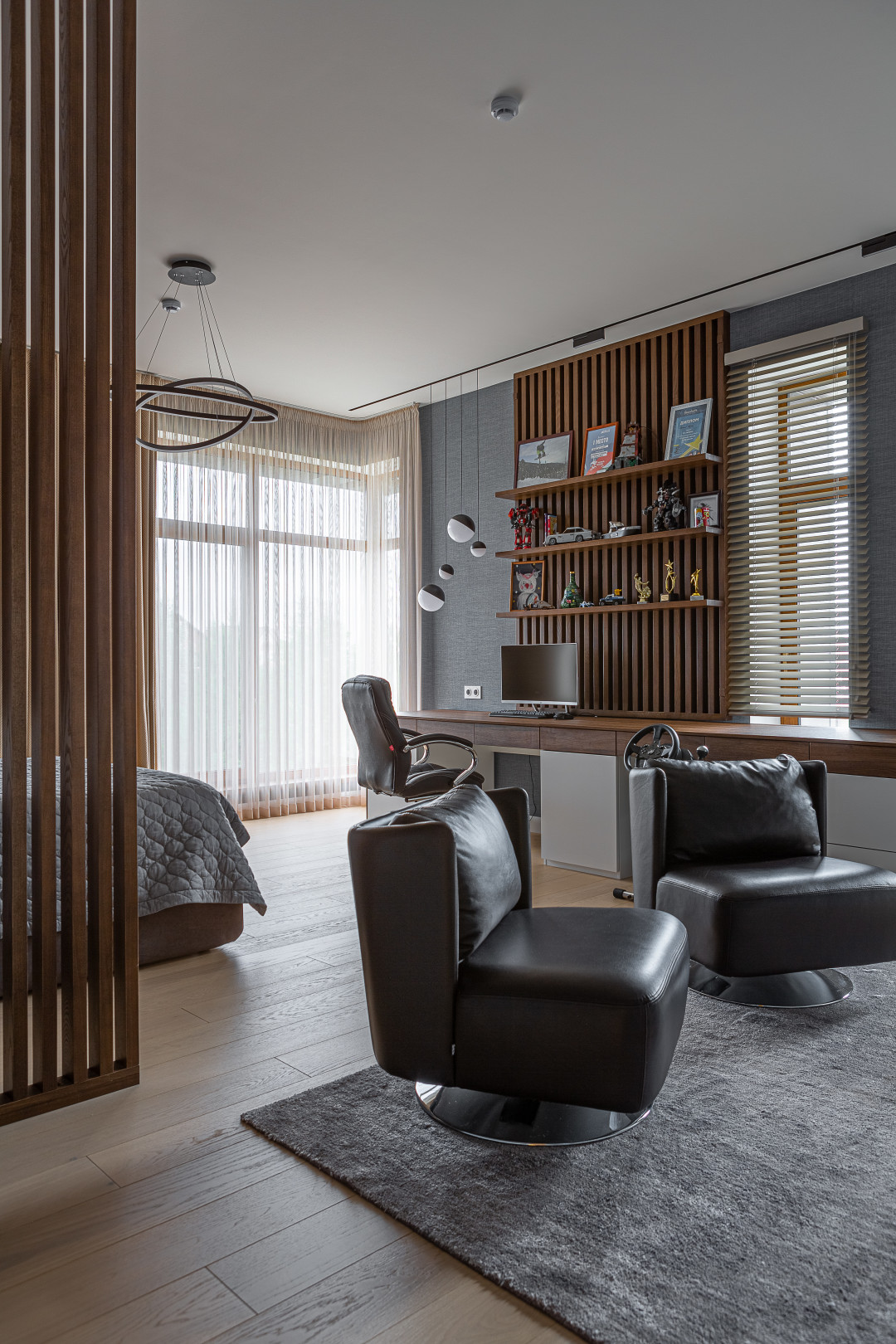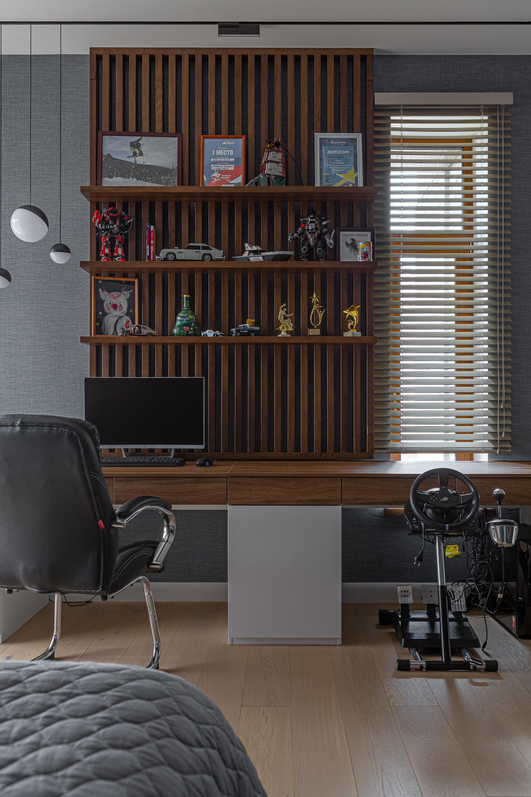 Детская комната для мальчика-подростка сделана без вы- чурности — он скоро вырастет, и интерьер выполнили как для взрослого. Получилась стильная и комфортная комната с зоной для Play Station.