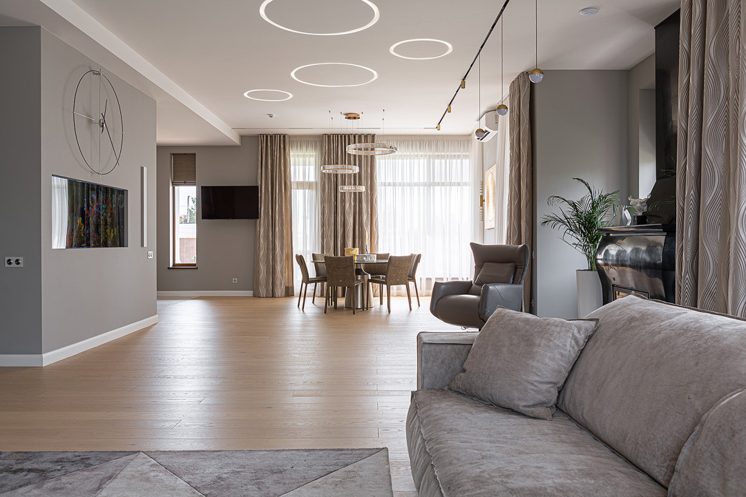 Интерьер получился минималистичный, но при этом уютный и комфортный. Я сам перфекционист, люблю аккуратность и чистоту во всем. Наш интерьер и спустя десять лет останется таким же, каким и был. Практически весь он имеет единую цветовую гамму: мы выдержали приятные тона, плавающие узоры, чистоту. Это дом, в котором мы отдыхаем. В каком-нибудь кафе нам нужна красочность, но дом должен быть спокойным, уютным.