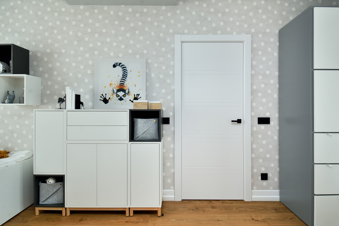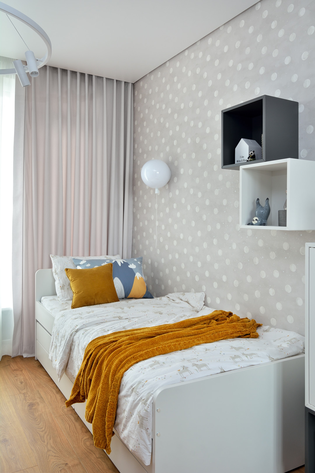 Мне очень нравится, как получилась детская комната. Удалось разделить пространство для двух мальчиков таким образом, что у каждого есть собственная спальная зона, а игровое пространство — общее. В нем предусмотрены столик, места для хранения игрушек и даже доска для рисования мелом. Обои на стенах детской заслуживают отдельного внимания. На них изображены луны, которые светятся в темноте, — это создает по ночам волшебную атмосферу.
