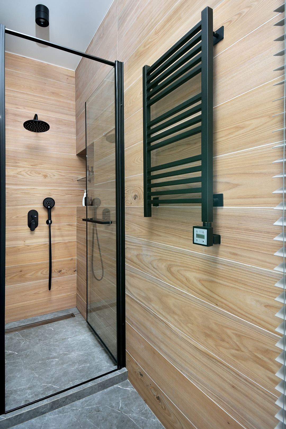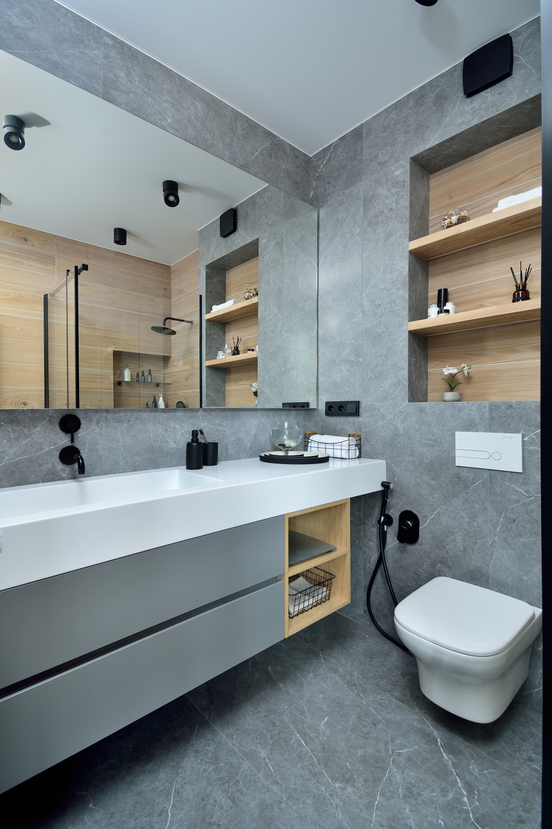 Все материалы в доме максимально близки к натуральным текстурам, таким как камень и дерево. Мы добавили немного графичности с помощью черных элементов: розетки, ручки дверей, элементы сантехники и светильники. Например, в гостиной использована встроенная система магнитного шинопровода — удобный и современный способ создания сценариев освещения. Светильники прикрепляются с помощью системы магнитов, изменить их положение невероятно легко — источник света перемещается в нужную зону одним движением руки.