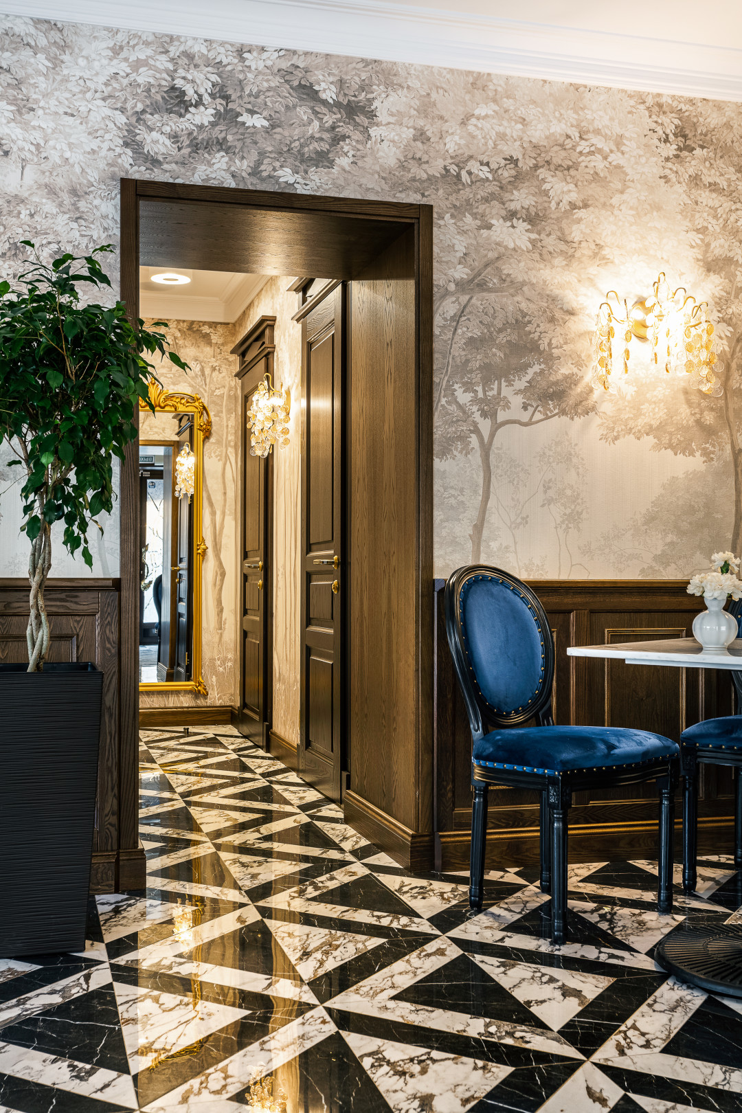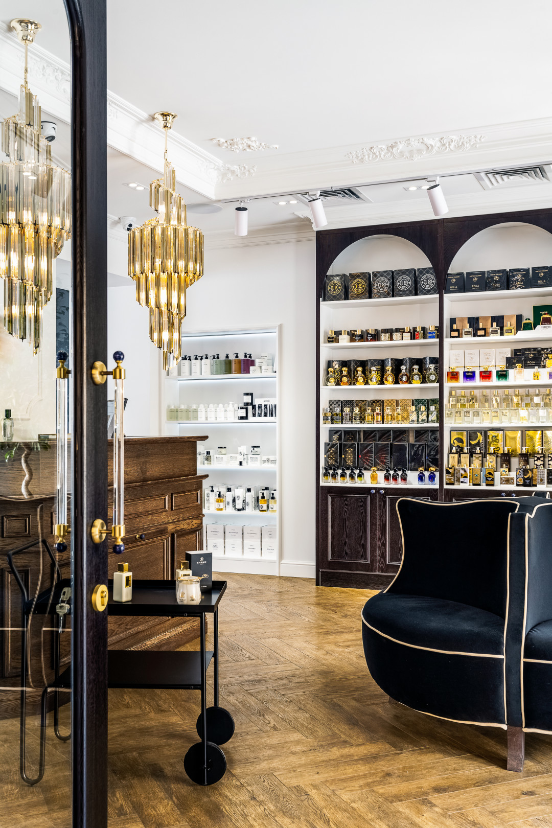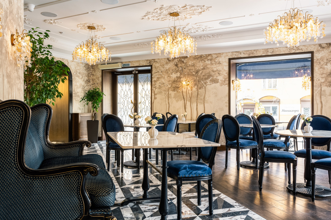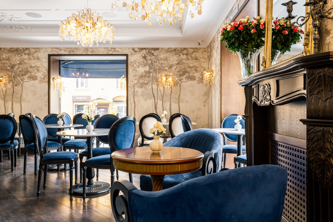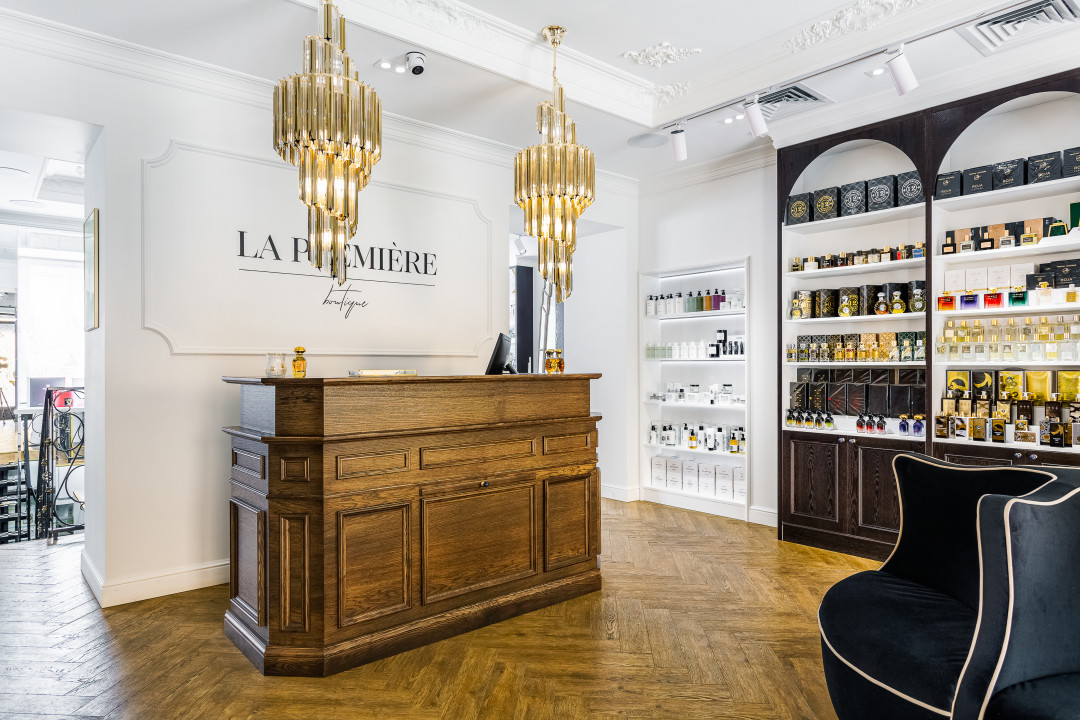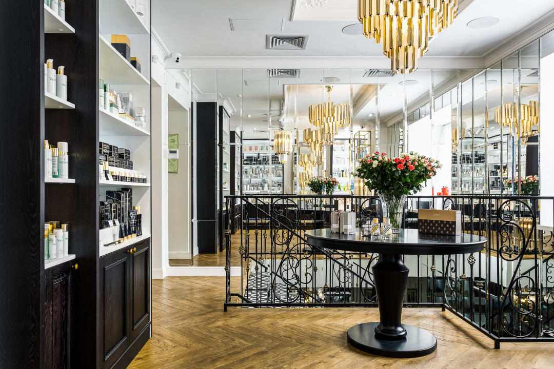 Историческая основа и экстерьер здания задали вектор классическому стилю. Кафе высокой кухни, совмещенное с бутиком нишевой парфюмерии и косметики, в котором представлены мировые бренды с вековой историей, тоже предполагают соответствующее интерьерное решение.