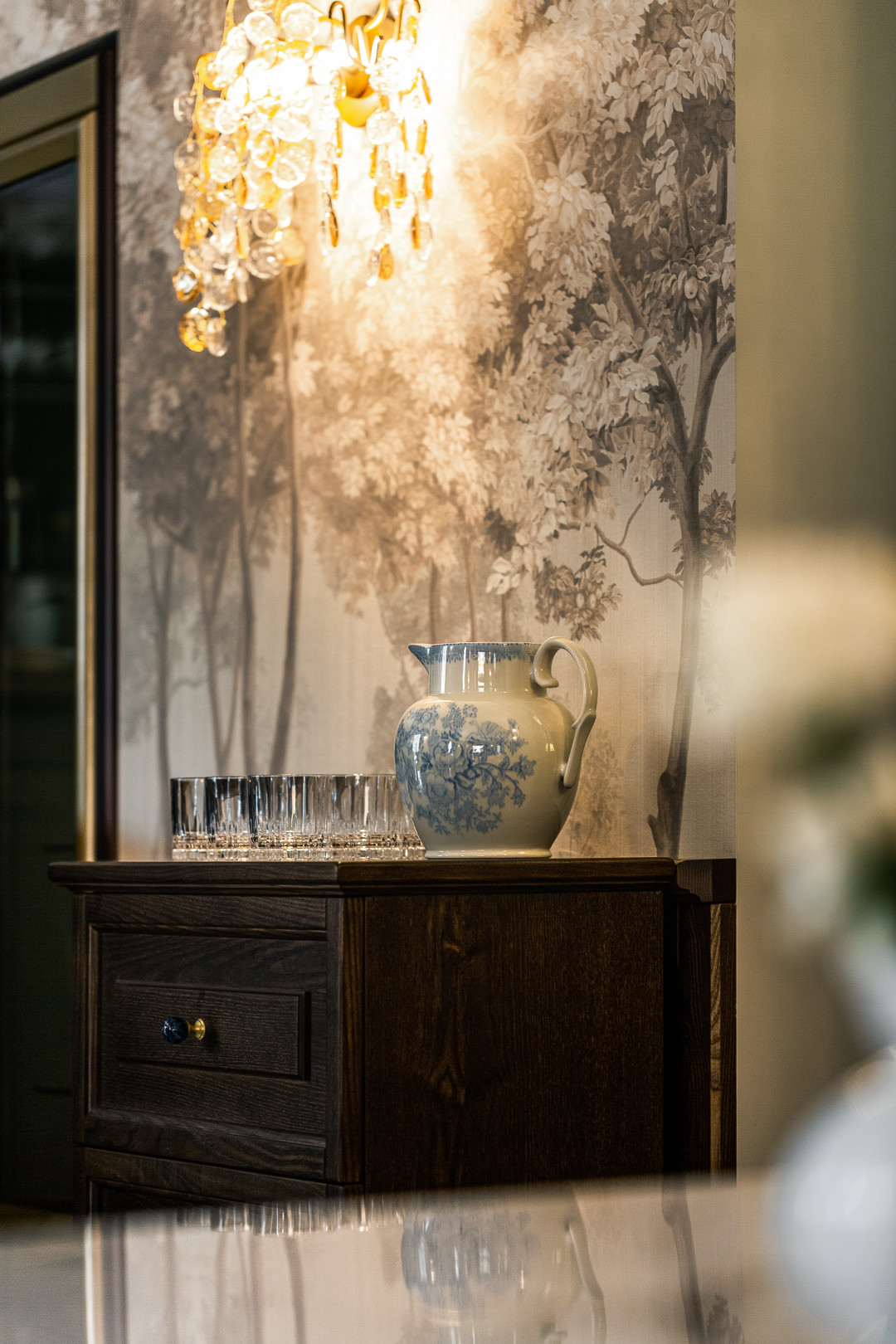Дополняют стилистику исторические постеры Жоржа Барбье, антикварные подсвечники, английская посуда, которую мы ждали несколько месяцев. Тысячью разных нюансов нам удалось создать красивый и функциональный интерьер, в котором все продумано. И он наверняка станет украшением ваших вечеров и вашего инстаграма.