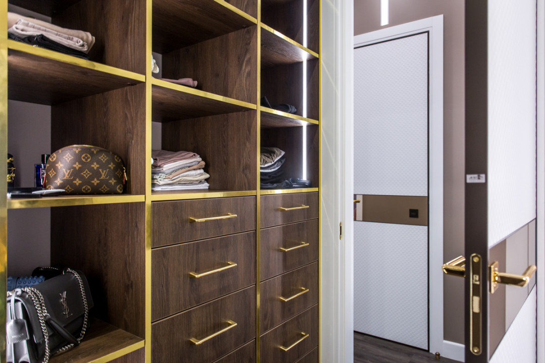 Особенное внимание обращают на себя металлические и зеркальные переливы декора, образующие законченный ансамбль. Интересна в проекте и колористика, которая плавными переходами оттеняет грани цветов, поочередно погружая в каждую комнату.