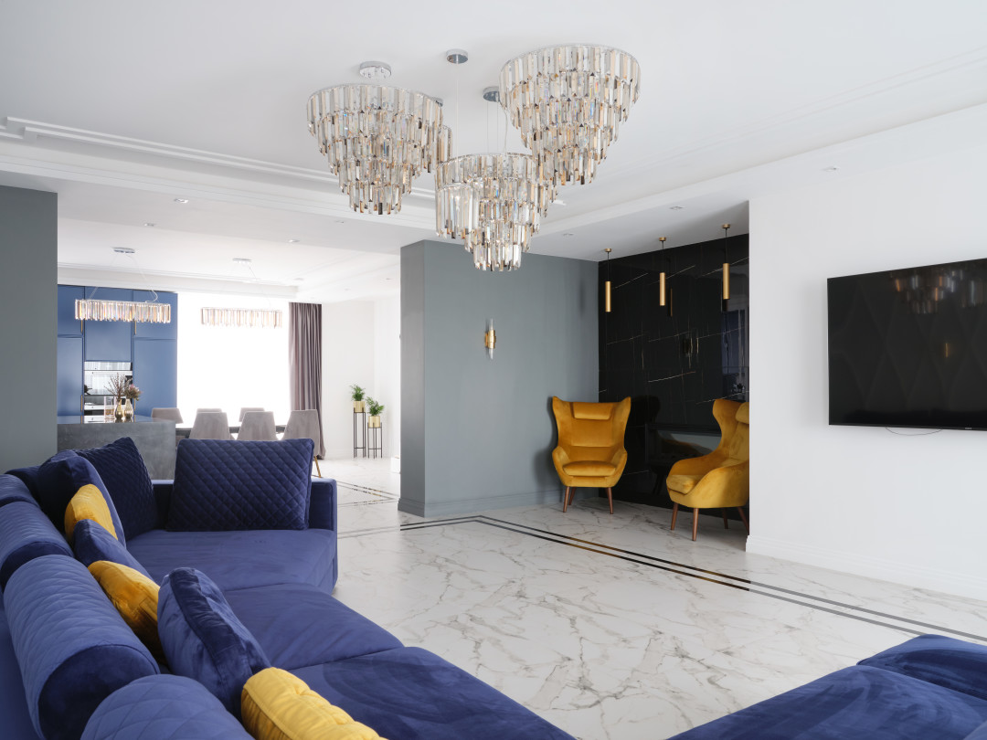 Декорирование периметров тоже стало увлекательным процессом. Открытые плоскости позволили создать интересную стену с ромбовидными молдингами и дополнить ее необычной отделкой потолка с современным карнизом с подсветкой