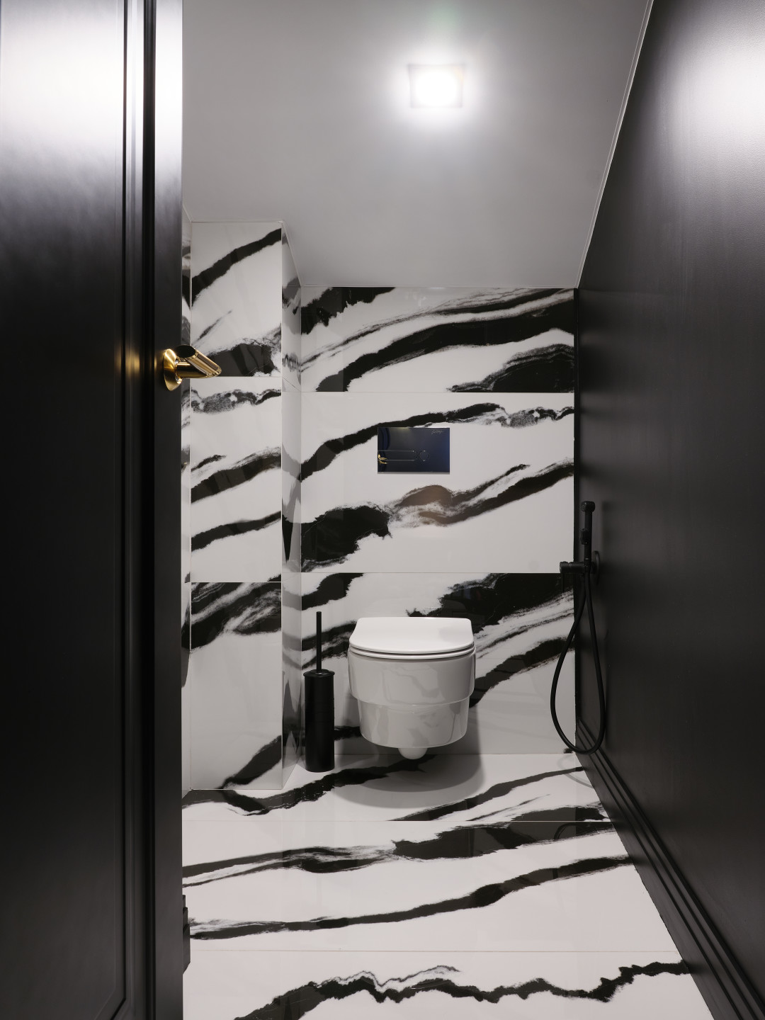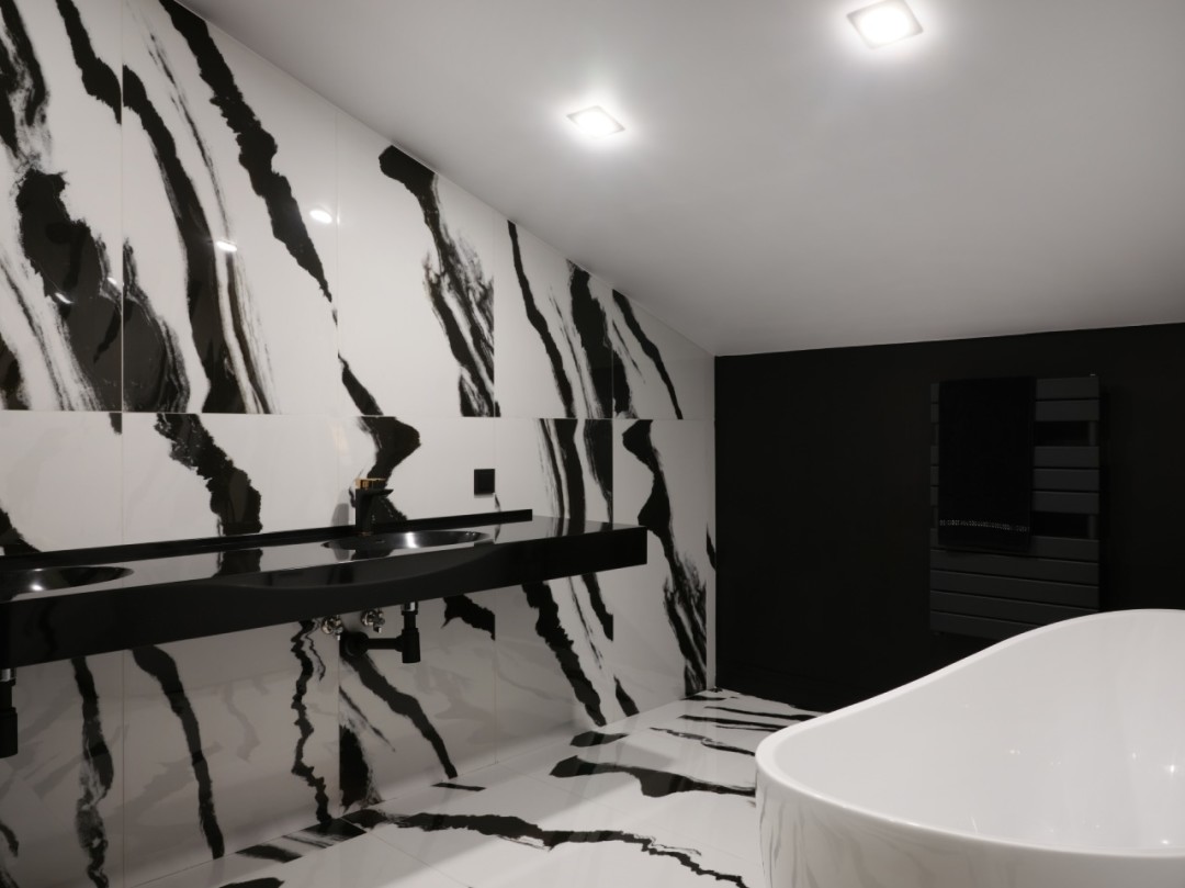 Задач было много. Но первое планировочное решение стало основным. Весь нижний этаж был отведен под гостиную, просторную кухню и каминную зону. Для удобства здесь же мы сделали гостевой санузел с оригинальной раскладкой керамогранита из недорогой плитки.