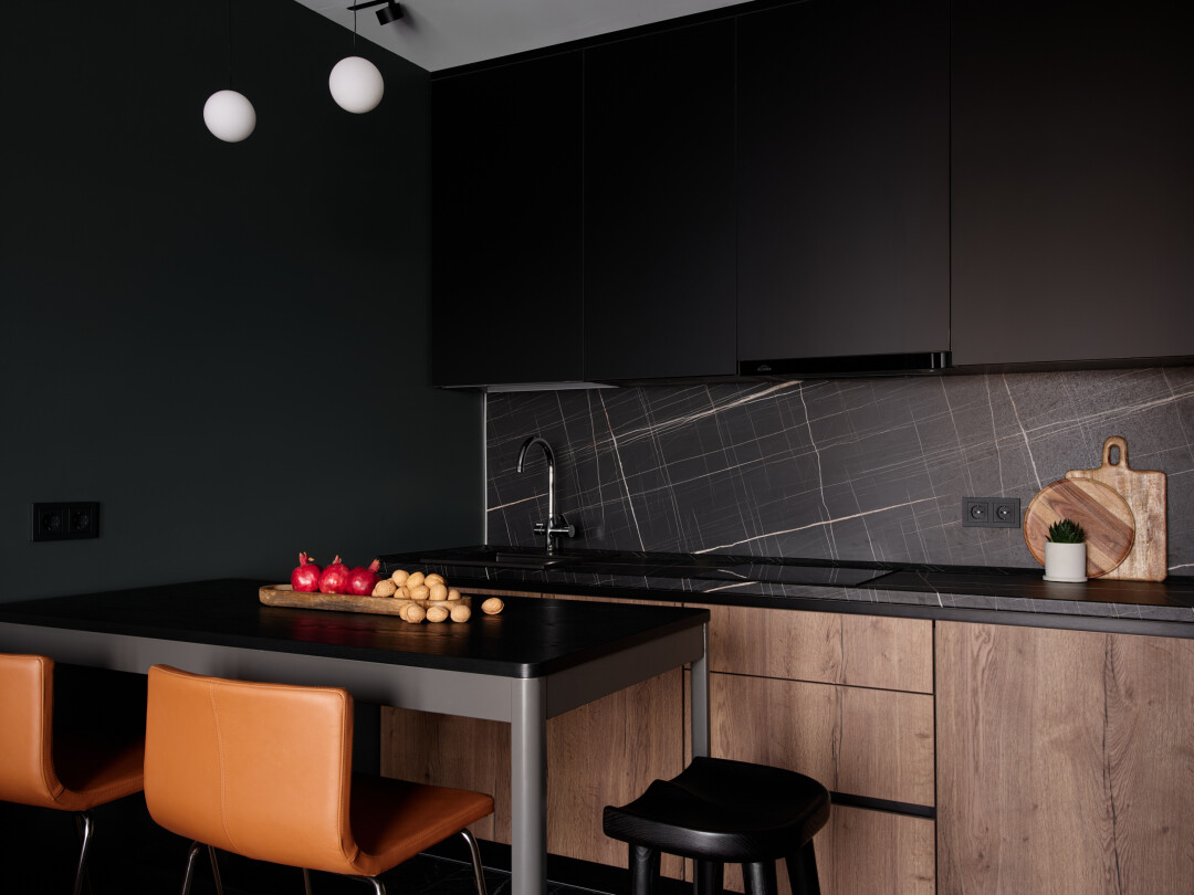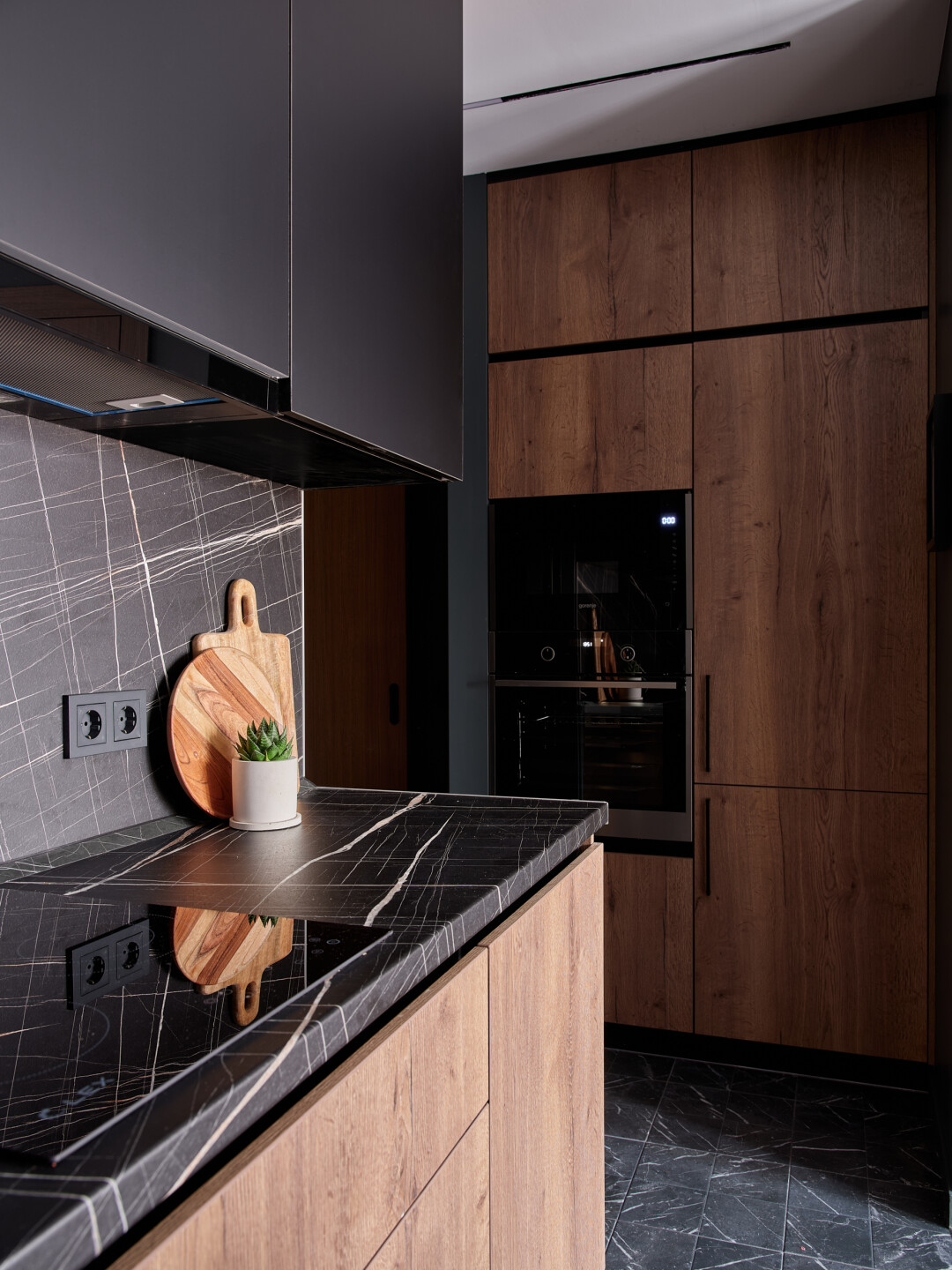 В интерьере преобладает темный цвет. Даже текстура дерева имеет насыщенный оттенок с темными включениями. Фурнитуру на дверях и розетки мы выбрали в черных и графитовых цветах. Спальная комната контрастирует с основным решением, но черные элементы декора и освещения мы сохранили и в этом помещении.