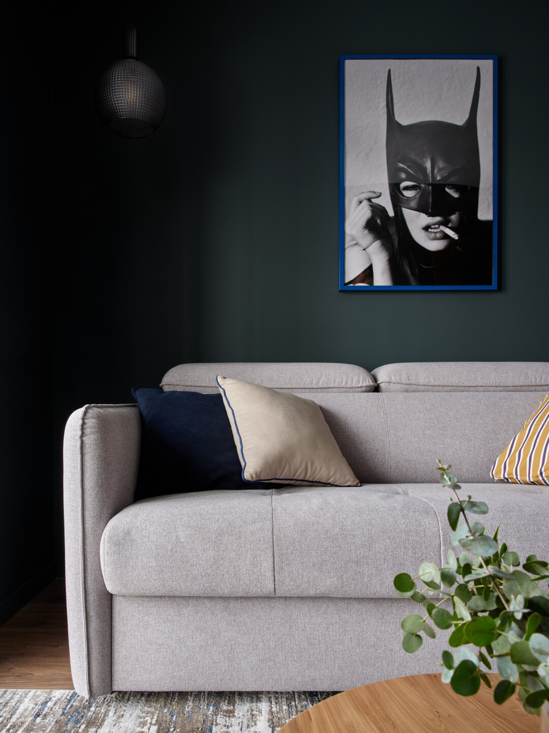 Отказались от привычных штор, так как очень не хотелось закрывать панорамное остекление. Ведь в нем — особенность этой квартиры. Выбор остановили на рулонных шторах, но в спальне мы выбрали модель «блэкаут» для комфортного сна.