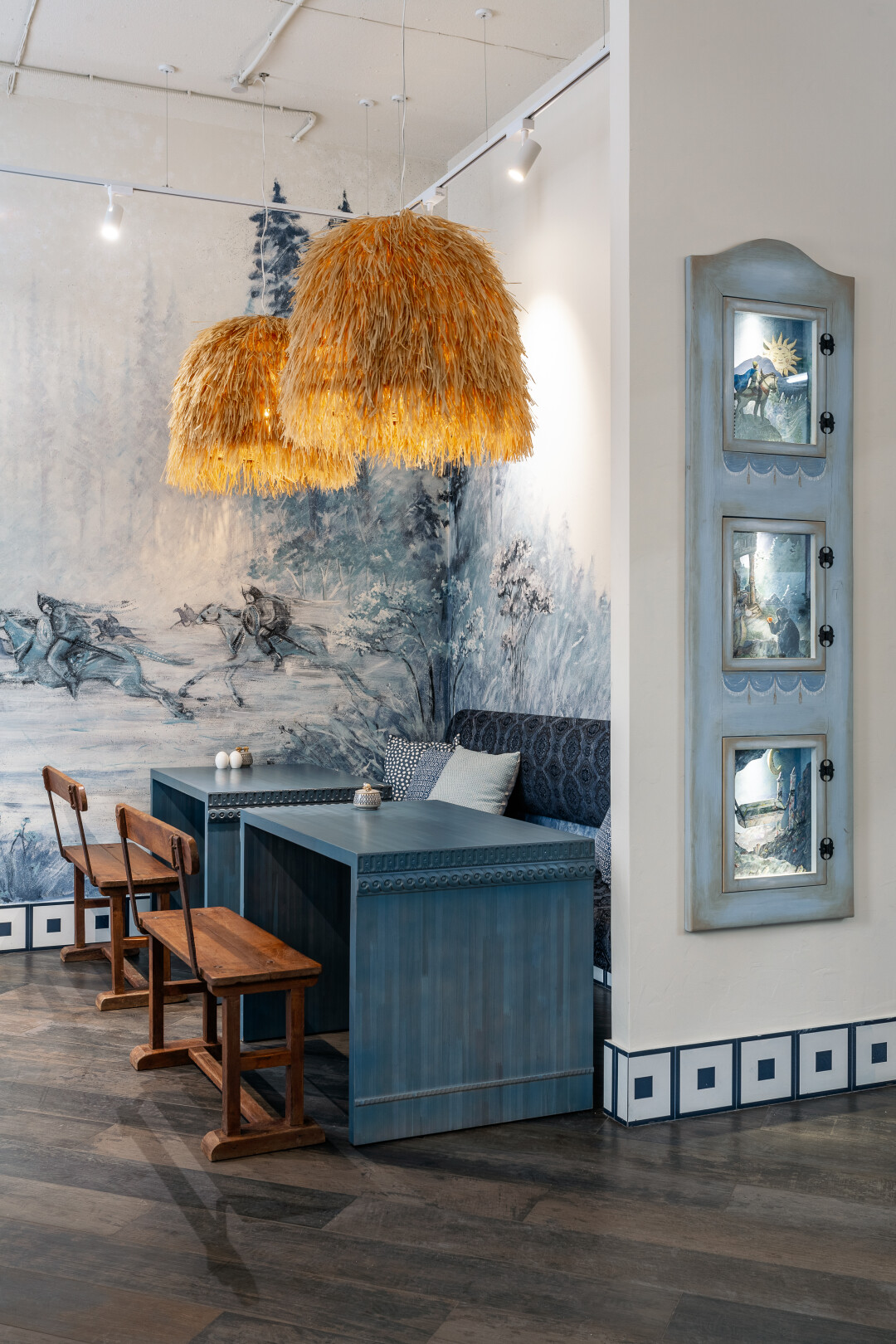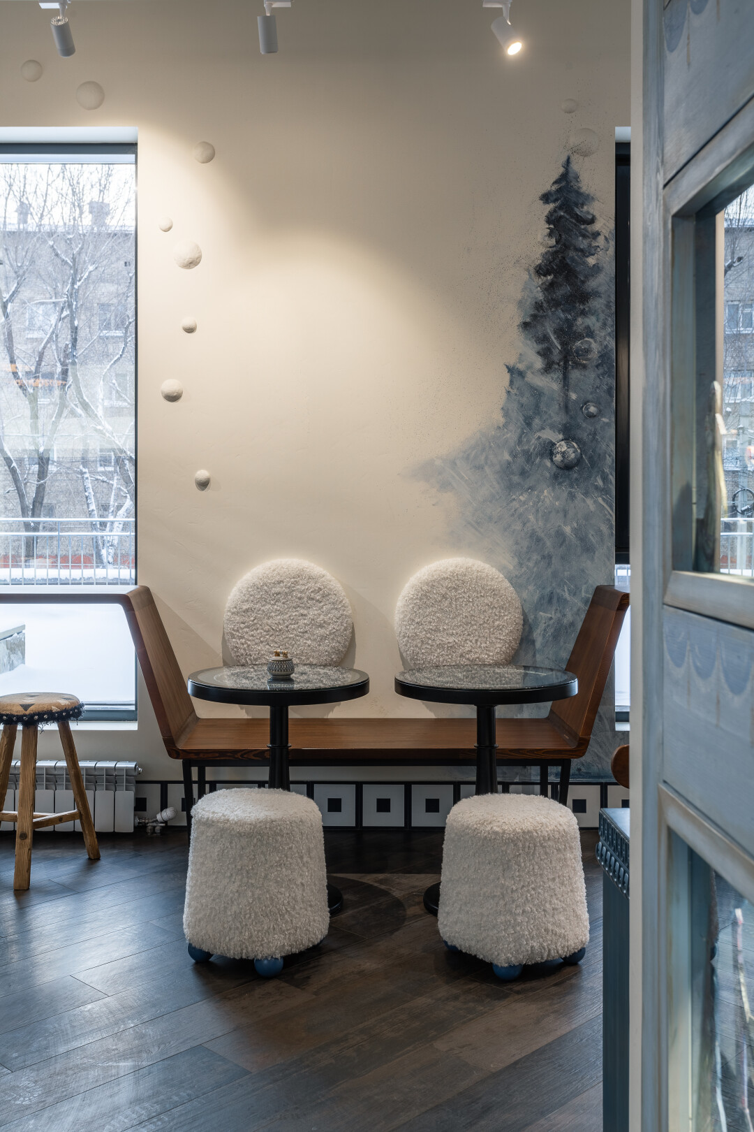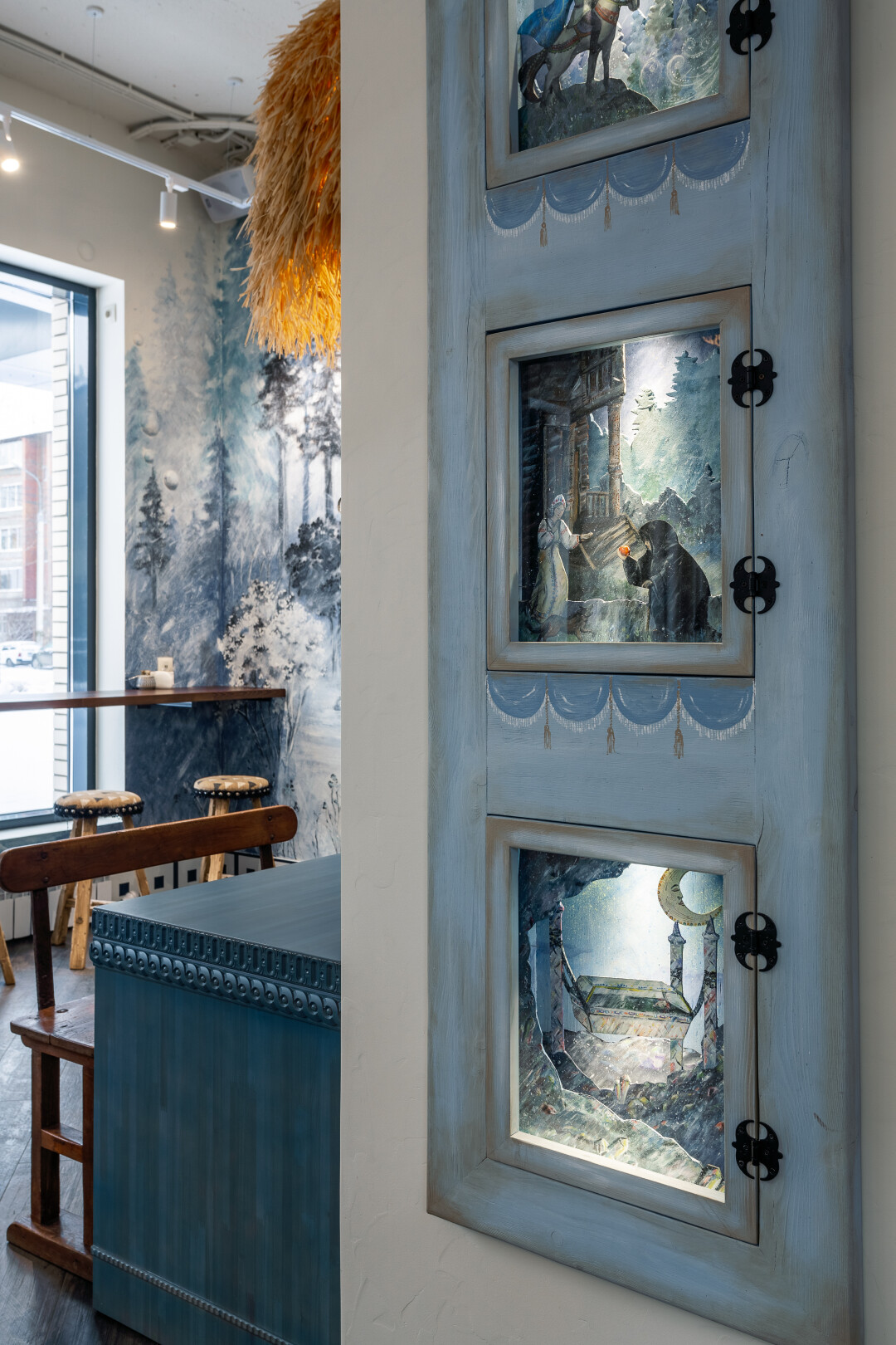 Перед нами стояла задача создать в кафе атмосферу чего-то родного, почти архетипичного, очень русского. Такое уютное пространство, которое вызывает добрые ассоциации, обыгрывает сюжеты русских народных сказок.