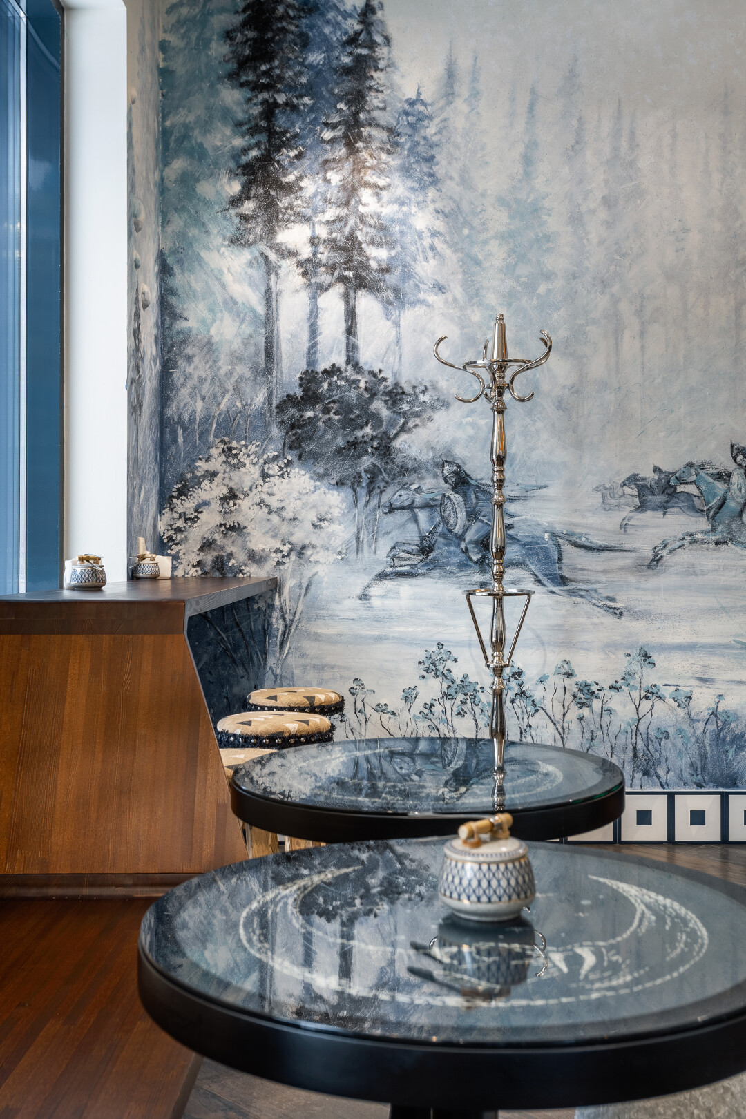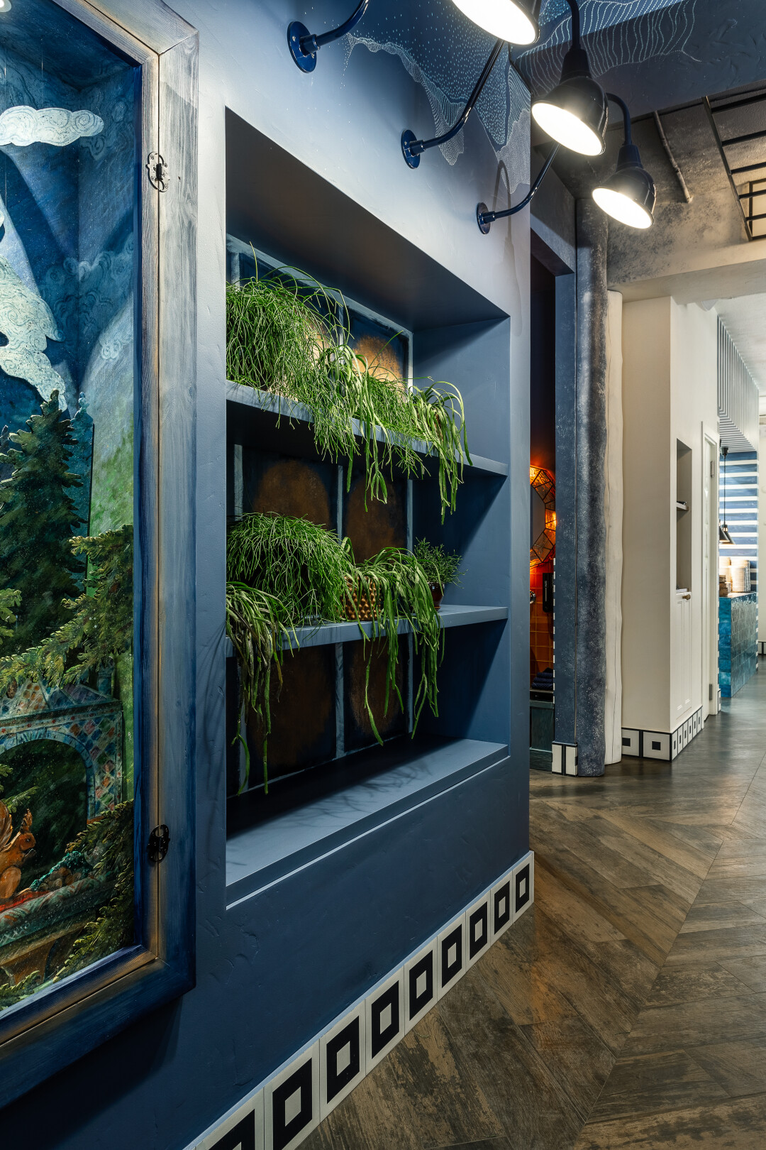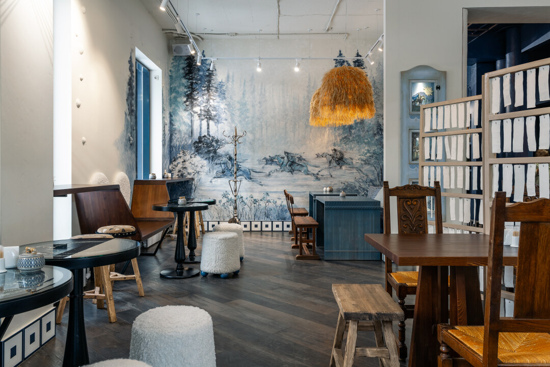 Перед нами стояла задача создать в кафе атмосферу чего-то родного, почти архетипичного, очень русского. Такое уютное пространство, которое вызывает добрые ассоциации, обыгрывает сюжеты русских народных сказок.