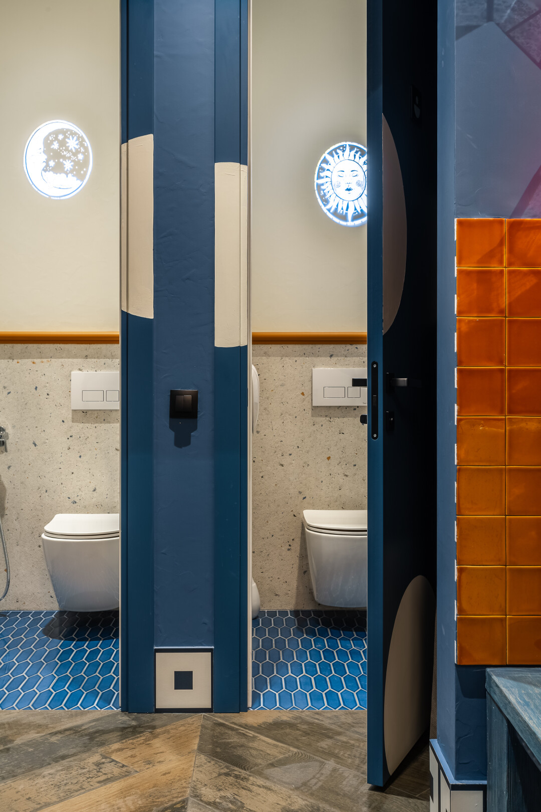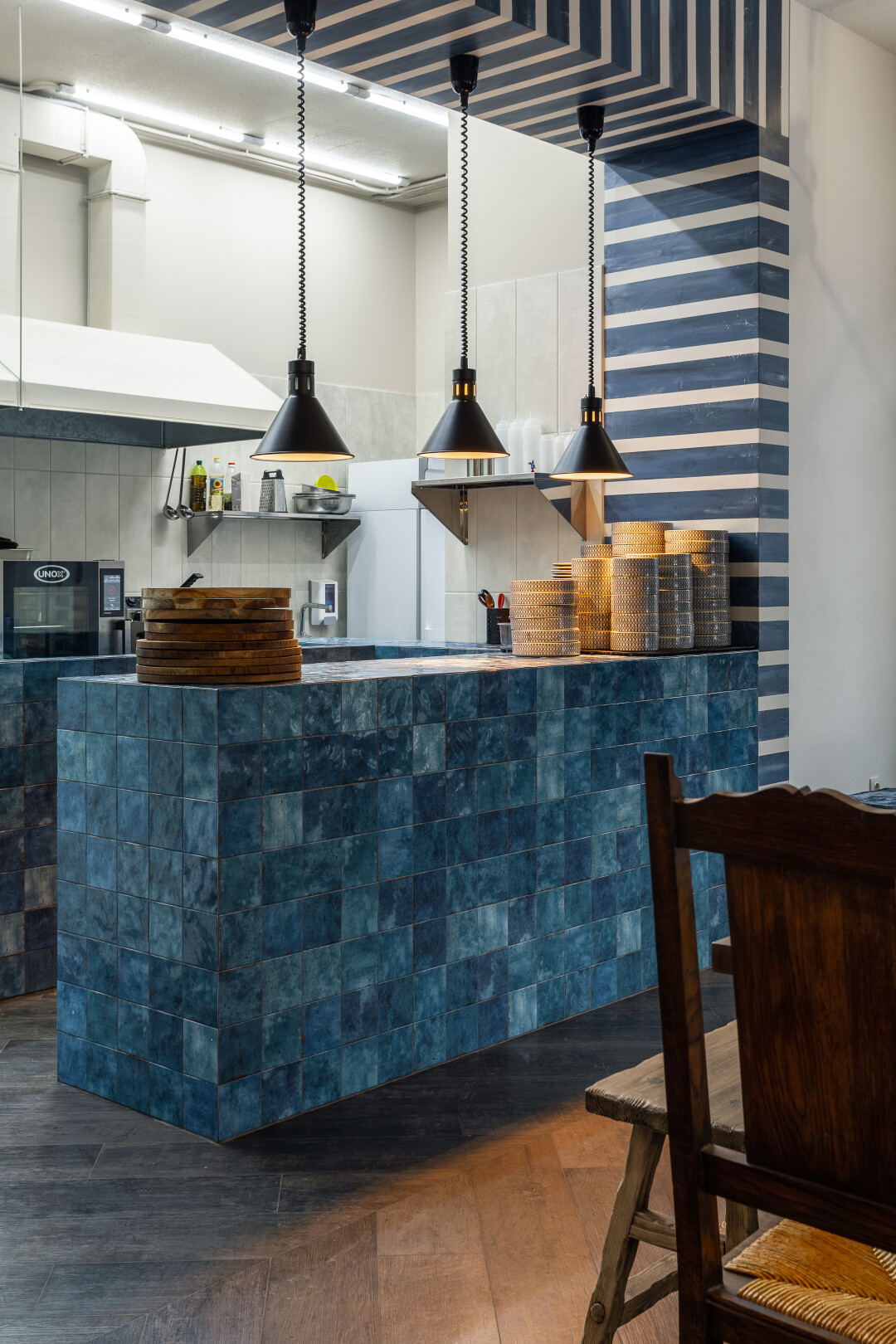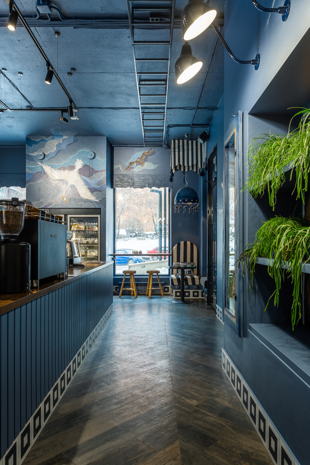 Нам нужно было также отразить связь с существующими локациями Cake Home. Доминирующие цвета интерьера — глубокий синий и сложный белый с легким ванильным оттенком. Они объединяют и одновременно создают контраст двух пространств. Смягчают и «утепляют» помещение оттенки выпечки — золотистые, песочные, охристые, угольные.