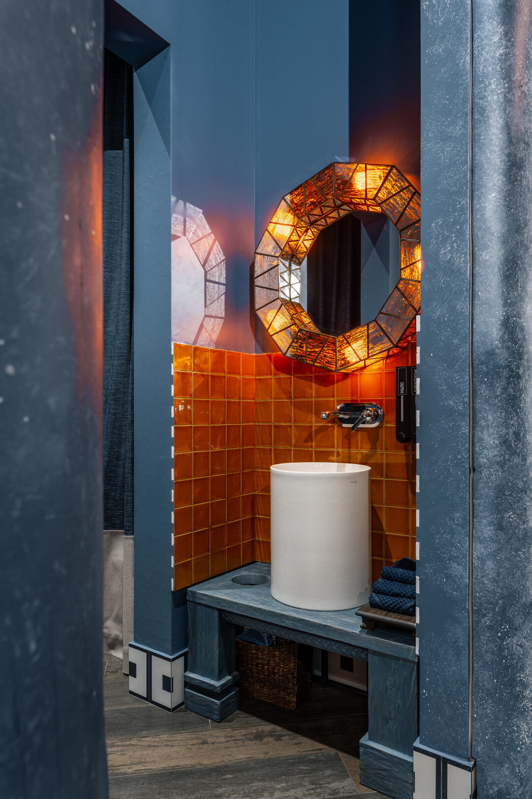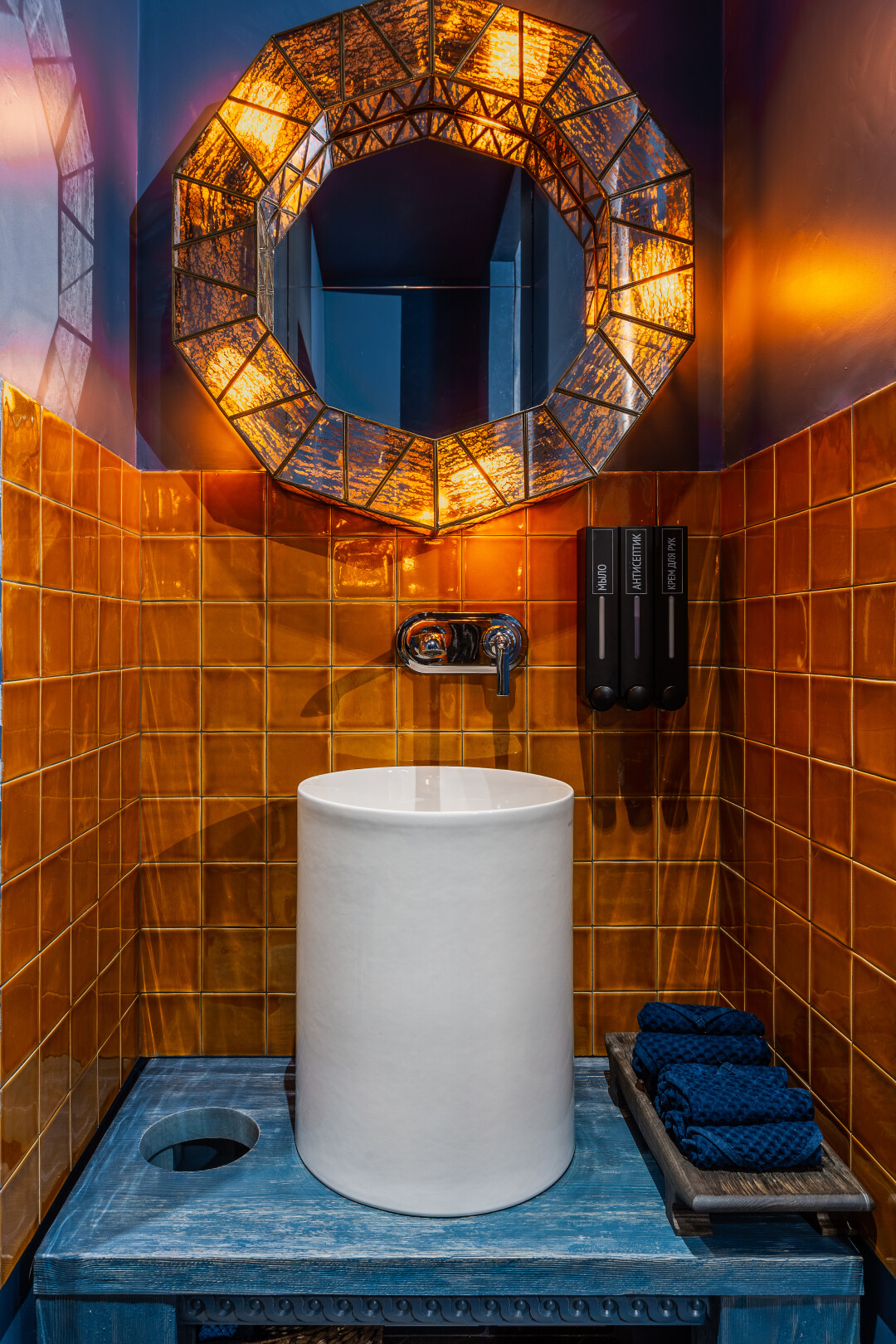 В отделке помещения гармонично соседствуют разнообразные текстуры: фактурное дерево, тонкая керамика, эмалированные поверхности, «бумажные» заломы, тактильный текстиль.