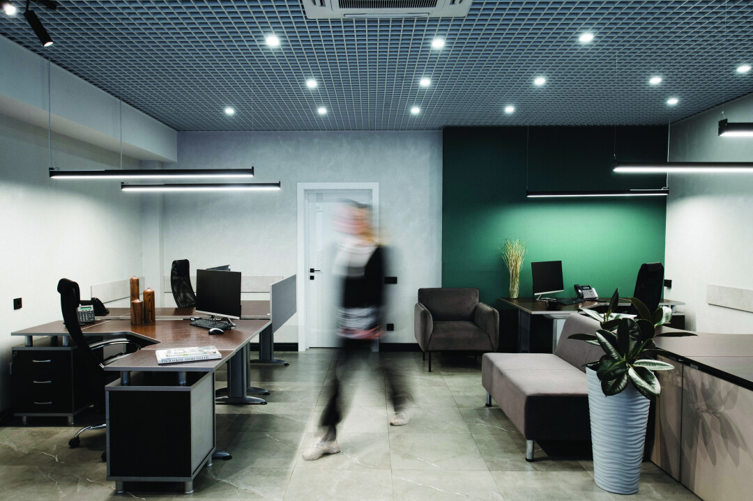 Во всех помещениях есть основное освещение, которое равномерно наполняет пространство светом, — светильники в потолок «Грильятто», лаконичные и незаметные. В кабинетах над каждым рабочим местом установлены дополнительные подвесные линейные светильники, расположенные на высоте 1,8 м от пола.
