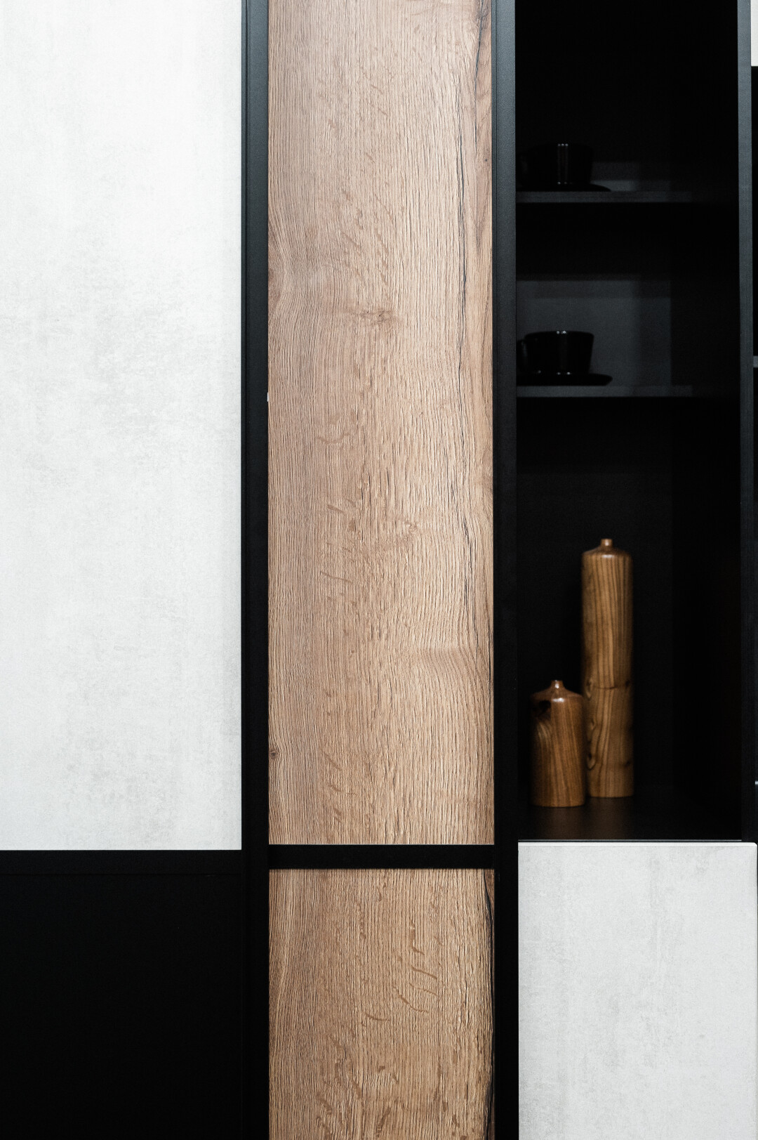 Оттенки черного отвечают за графичность и подчеркивают цвет техники и оборудования. Текстура дерева подыгрывает нам: в кабинетах использованы более темные оттенки, подчеркивающие мебель, а в зонах отдыха превалируют естественные тона: теплые и натуральные для полноценного релакса. Отделочные материалы подбирались по эксплуатационным характеристикам. Они должны были быть просты в уборке, как можно дольше сохранять первоначальный вид.