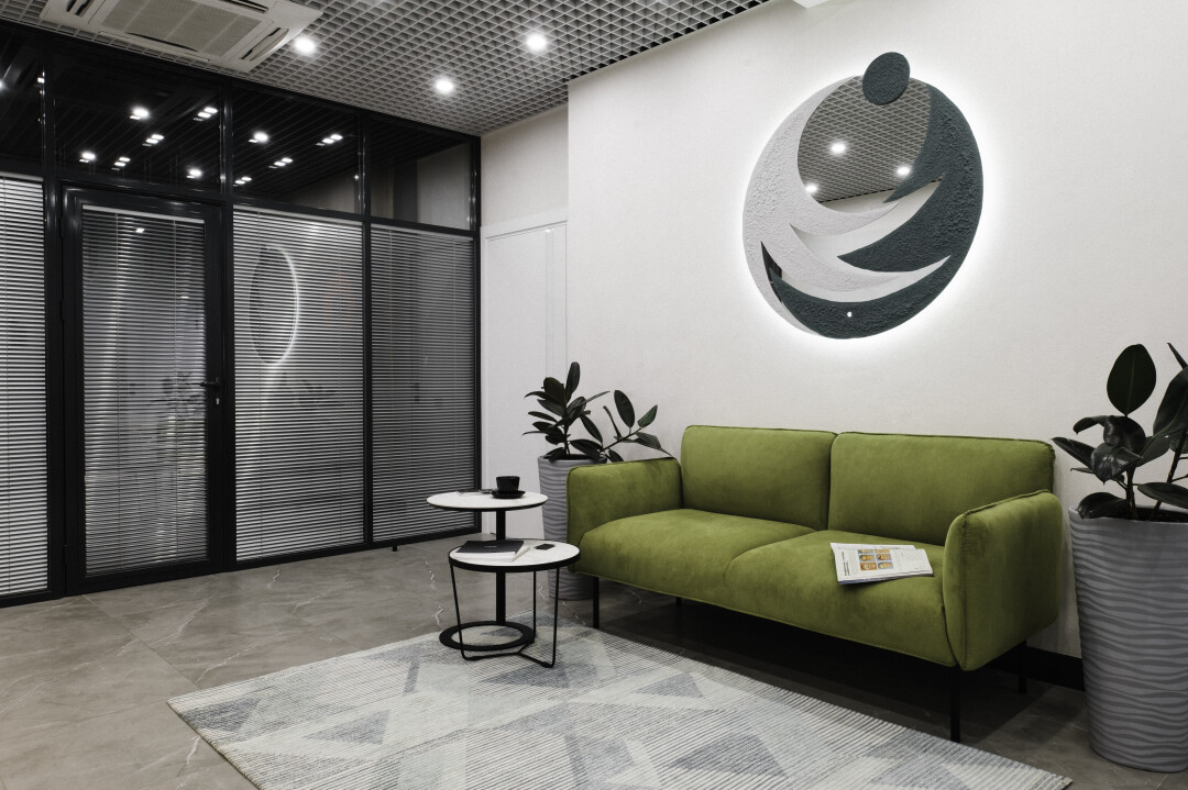 Мы предложили несколько вариантов цветовых решений интерьера. Доминантным стал зеленый цвет, который отражает фирменный стиль компании. Стены