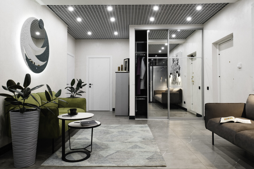 выкрашены в матовый глубокий цвет, яркие зеленые акценты присутствуют и в обивке мебели. Светлый фон объединил пространство, сделал его воздушным и легким. Вместо покраски мы применили декоративную штукатурку. Она добавила объема и глубины покрытию стен.