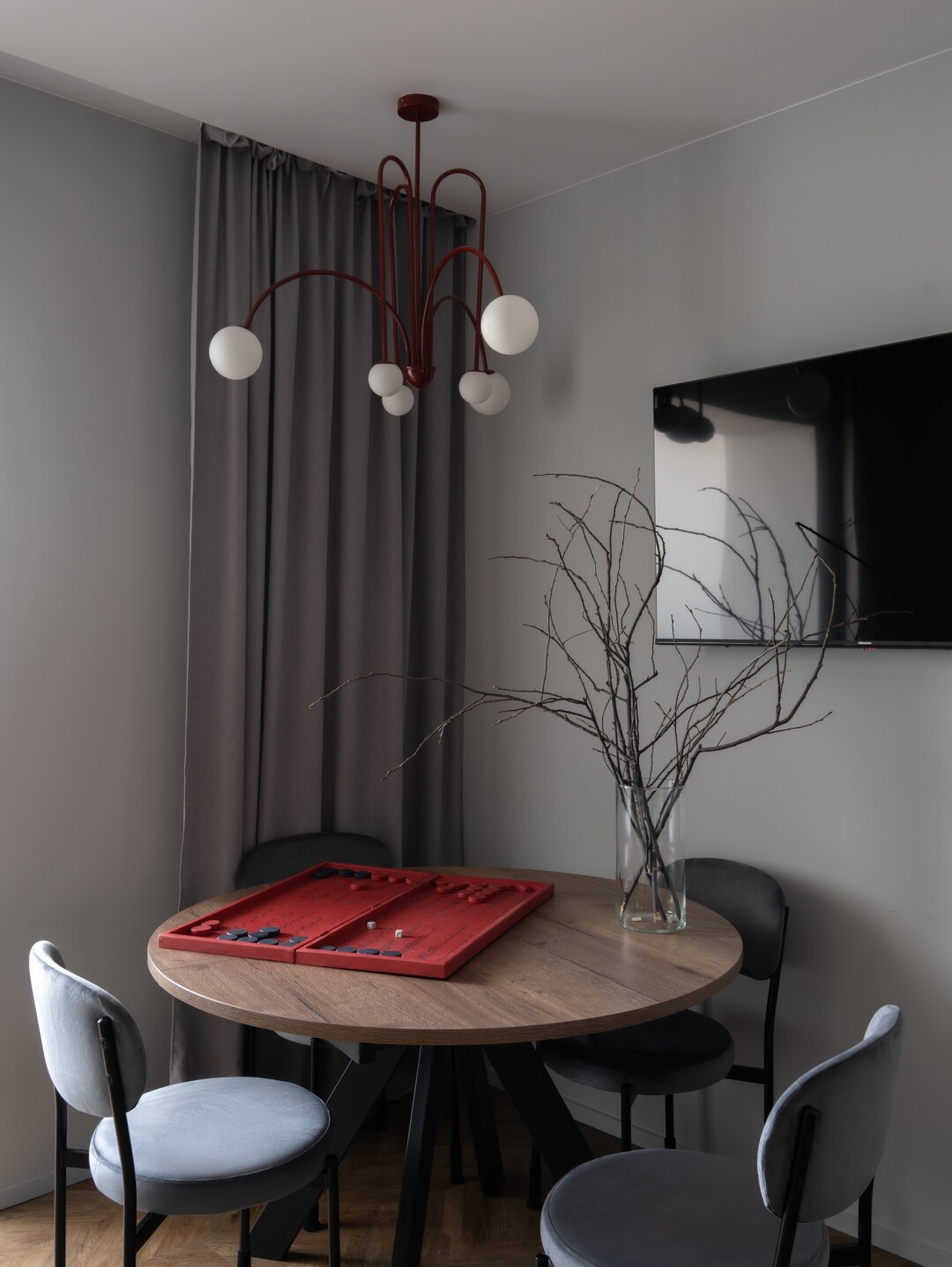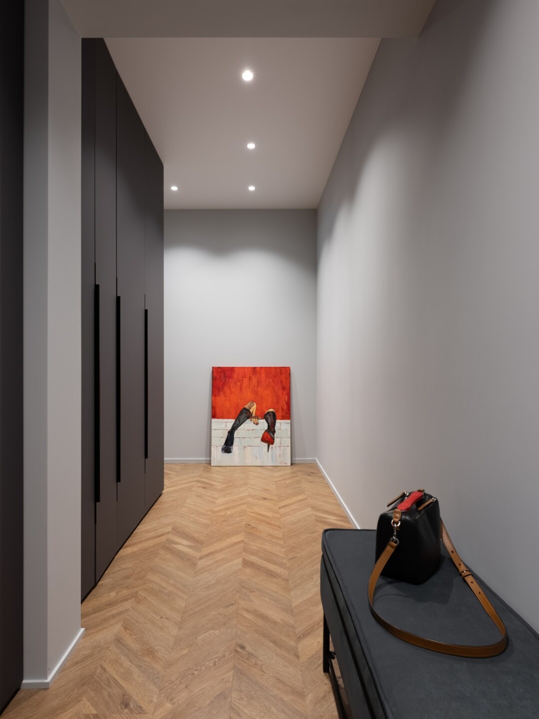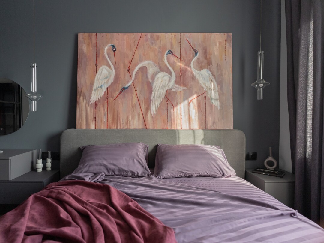 Изюминкой этого интерьера стали авторские картины, которые задали тон всей концепции интерьера. Их специально создала один из дизайнеров этого проекта, а по совместительству художник, Екатерина Голышкина. На фоне лаконичных стен и мебели они выглядят подчеркнуто выразительно и добавляют интерьеру неповторимый колорит.