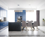 Большие пространства дают волю фантазиям дизайнера. Идея кухни-гостиной в сложном помещении с эркером родилась после множества планировок. В нем появился остров и стол, который стал гармоничной частью периметра.